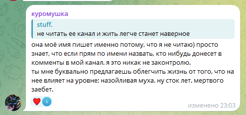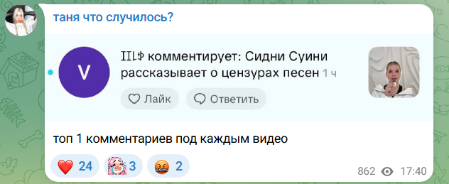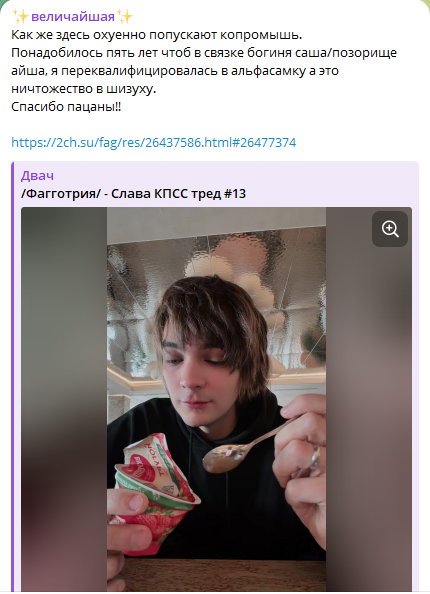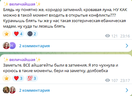 Пиздец Мышь сгорела с хуйни. Недавно мужа заставила удалить тикток с рандом тян (которая его в туре сопровождает, менеджерка или хз), потому что там комментарии были "а как же Саша?". Сразу после этого запостила их фотки с подписью immortal family. Теперь вообще публично прыгает на Айшу. Сам Слава тоже нервный, ходит срется с ноунеймами в комментариях, ещё и во время тура. А писала, что матерью планирует стать в 26, вот это уровень зрелости.