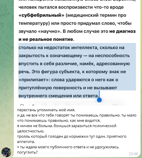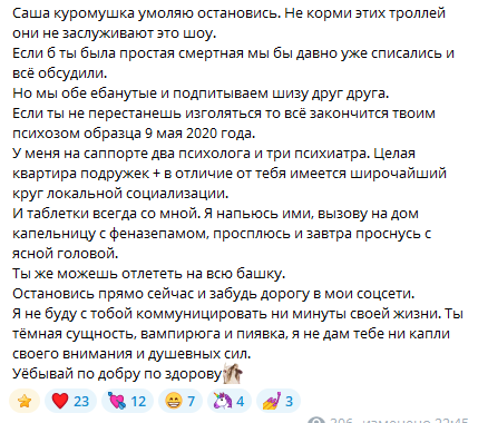 >>6465917 >консерва считает себя выше других и не любит, когда с ней пытаются быть на равных Это правда. Она ещё умело входит в позицию жертвы когда выгодно и обижается как подросток. И очень склонна к манипуляциям. Вон как ее хомячка пытается у нее вымолить прощение за не так сказанное слово, но эта упрямая ослиха все равно в позиции оскорбленной. >какой же у нее блять наверное самомнение, интересно, а люди ирл выносят ее? или она одинокая недопонятая волчица? У нее маленький круг общения. Настя Горшкова ее лучшая подруга вроде пока выносит. Я как понимаю она редко видится с людьми, видимо, на расстоянии ее ещё как-то выносят, по часу в неделю может ещё терпимо