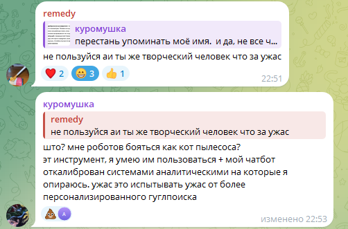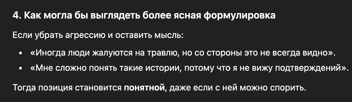 >>6466579 >Когда слышу про таких страдалиц, которые годами бесконечно терпят определяю их в нарциссихи, которые живут за счет чужой жалости. Ты это высрала в ответ на рассказ о травле, а не то, что на скрине. Еще хуй знает, что ты высрала гпт. Только уо вырвет одну фразу из переписки без контекста и принесет это как пруф. Еще и гпт, который и любую шизу подтвердит и оближет тебя, смотря как подать