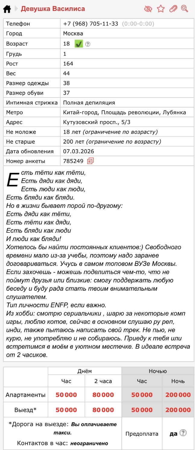 >>6466533 Знакомая мне как-то рассказала историю про тян что учиться в МГУ и у неё обеспеченные родители но она в 17 стала эскортницей тупо из жадности и жажды ещё больших денег но ебля со стариками отразилась на кукухе и она пошла к психиатру(И ходит до сих пор).