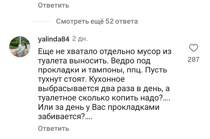 У вас есть ведро в туалете? Помню пришла в гости, надо было поменять прокладку, а там нет ведра. Как же я охуела. С комментов оголтелых ненавистниц прокладок в ахуе. Если бы не видела, что это женщины, подумала бы, что чушки серят.