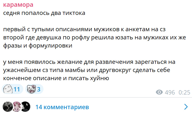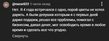 я не хочу никак быть ассоциированной с ней моя главная мотивация писать это не лайки не реакции и не залетевшие видео в тиктоке или в рилсах (я намеренно не снимаю это) а чтобы свершился страшный суд и чтобы с настей гречкой после моих слов не стала встречаться ни одна девушка в здравом разуме ради своего же блага