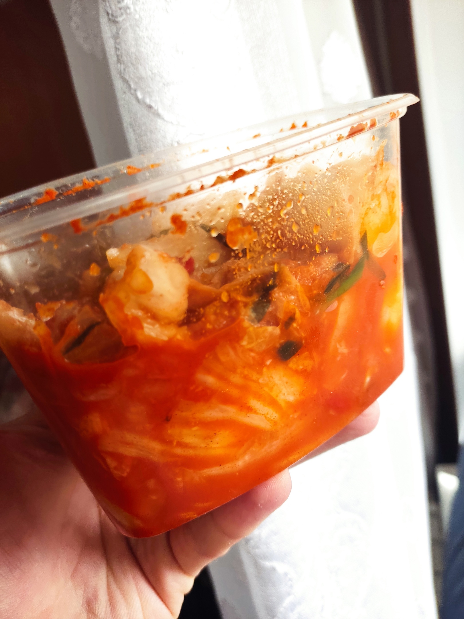 Купил кимчи у китайца на рынке. Очень похоже было на то, что приготовил я сам, только это квасилось заранее нарезанным и с немного другим набором зелени. Ещё не хватало рыбного соуса во вкусе, в нём содержится глутамат натрия, который хорошо "подсвечивает" результат работы молочнокислых бактерий. Добавил, перемешал, результат на фото.