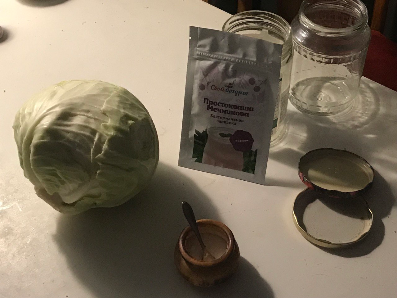Квашеная капуста - взял 2 кочана (около 2 кг штука), порубил и кинул 2 столовые ложки соли + 2 щепотки сахара. Капуста даже сока толком не дала, походу на рынке наебали с сортом или хз. Короче тоже выкинул.