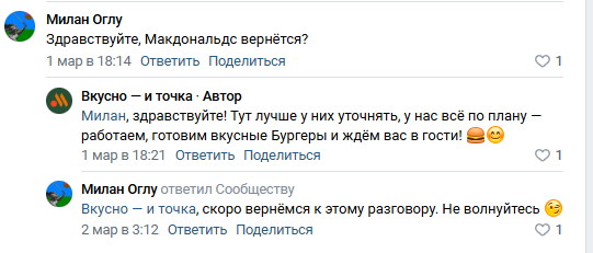 >>701030 >В конце мая топ-менеджер говорил, что "Вкусно - и точка" в 2024 году планирует открыть 50 новых заведений. "Планы (по открытию в этом году - прим. ТАСС) сохраняются, и сохраняется наша амбиция, что - наверное, не в следующем году, а в начале 2026 года - мы хотим перевалить за 1 тыс. предприятий по всей стране", - сказал Пароев во вторник.