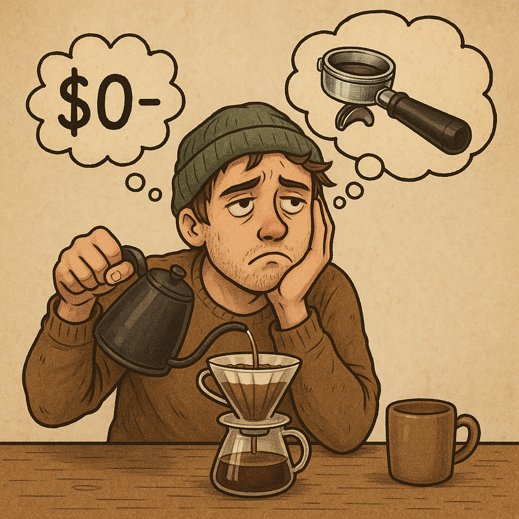 В пролетарском квартале, где бетонные стены впитывали запах дешёвого табака и отчаяния, жил нищий дурачок по имени Артём. Его единственной роскошью был кофеин, добытый через пластиковую воронку V60, купленную за гроши на озоне.