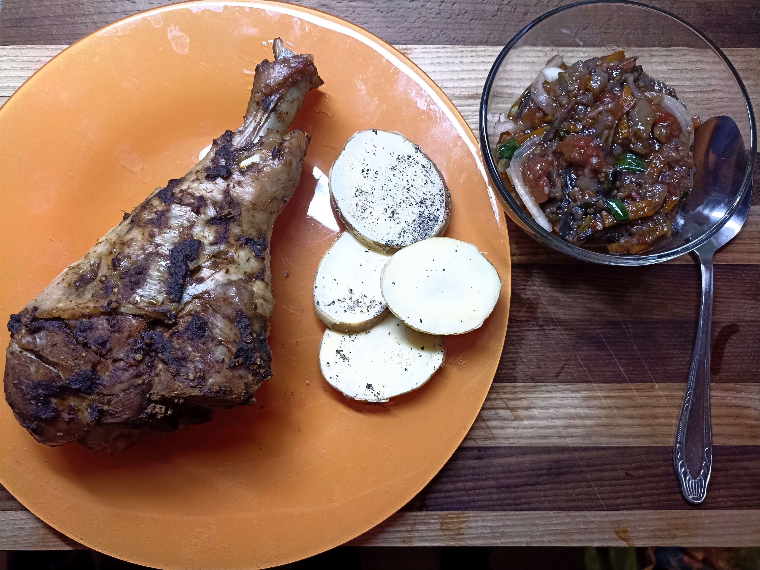 Насмотрелся я на эти ваши >>731124 индюшачьи ноги и взял пару голеней. Потушил в МСК 20 минут на бульоне от предыдущей курицы, который уже месяц лежал в морозилке, затем подснял шкуру сделал надрезы и упихал туда немного аджики, натянул как смог кожу обратно, но херово размазал аджику по поверхности. Духовка на 25-200 подсушила это всё, однако молодой необкатанный картофель вышел то полусырым-полузасушенным, можно смело отдать его голодающим В качестве отвлекающего манёвра тушеные овощи с кинцой и зеленым луком, тут всё отлично я постоянно готовлю такое к рису. Понимаю что это всё в сочетании с недопитой в прошлые выходные прокаченной до 0.375 чекухой водки сведёт меня в могилу лет на 5 раньше, но ничего не смог с собой поделать