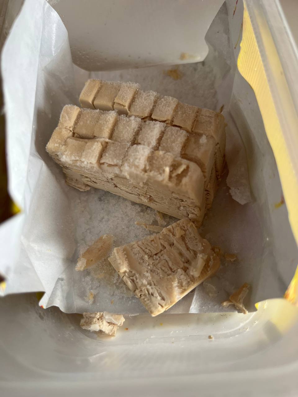Берём 1 шт дрожжей Заливаем водой, размешиваем, получается мутная водичка, как виднопо фото никаких кусочков там конечно же нет Дрожжи из морозилки подкармливаю немножко сахаром, размешиваем