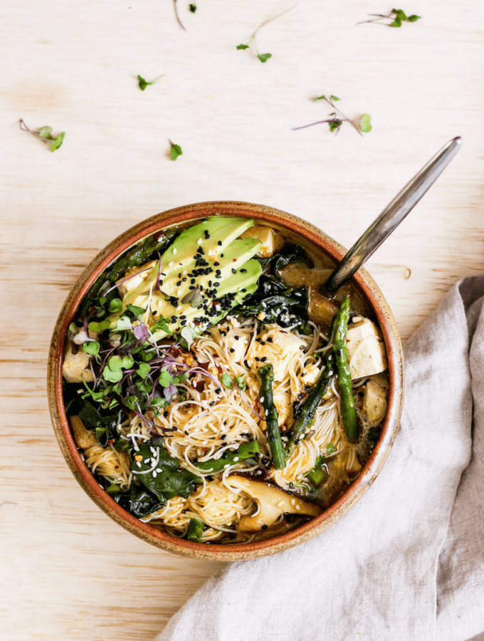 Супчик на завтрак. Креветки, лапша рисово-гречневая, безглютеновая. Ботва свеклы. Заряд белка, йода и клетчатки на весь день.