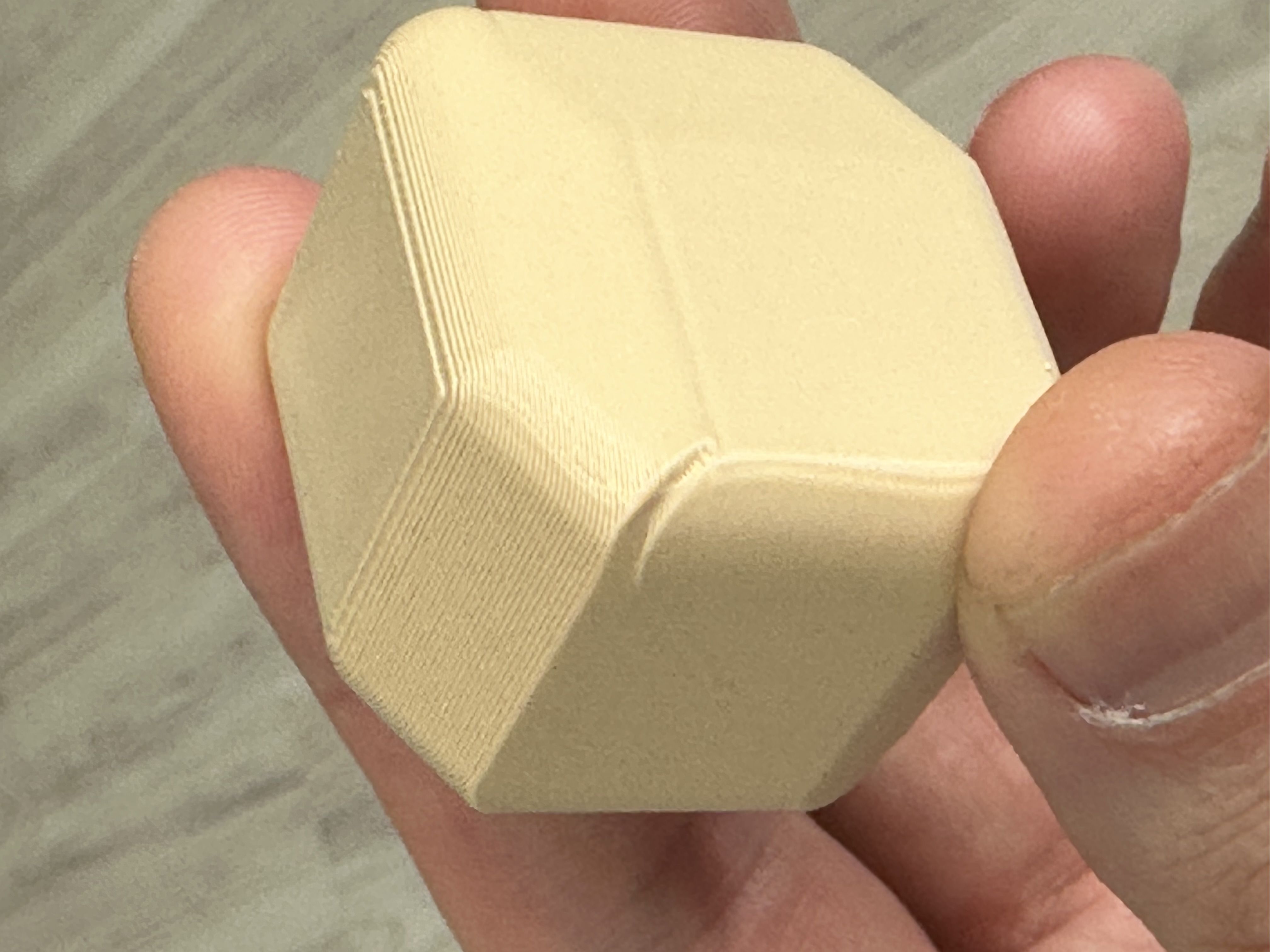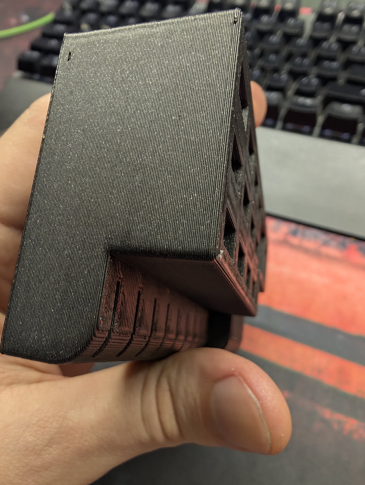 Аноны, подскажите что это за пунктир такой странный на верхних слоях? При том он ровно по внешним периметрам идет, внутри верхняя крышка нормально получилась. У меня есть только предположение, что во время печати из-за усадки краи чуть отогнула и сопло по ним шкрябало и получился такой эффект