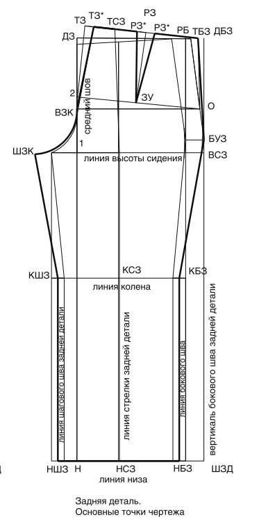 Посмотрите на выкройку брюк. Она типичная, и все методики дают похожий результат. Расстояние от линии сгиба до среза банта на передней половинке всегда больше, чем на задней от этой линии до заднего среза на линии бёдер. И лишь у Злачевской эти точки совпадают. Почему так? Вроде бы кажется логичным, что линия сгиба делит ногу пополам и на бедрах проходит на 1/4 от центра.