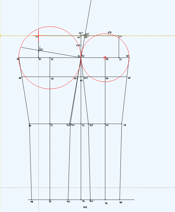 Причем, этот центр на задней половинке почти везде строится между краем бокового среза и концом клина. То есть, если я изменю длину шага, то изменится и линия стрелки. В емко сэв и мюллере средняя точка вообще всегда между боковым срезом и краем клина, причем, в мюллере это точка на продолжении линии от колена и находится на линии бёдер, кто строил, понимает, о чем речь, а в емко сэв просто это край клина. Кто как хочет фантазирует, я хуею просто.