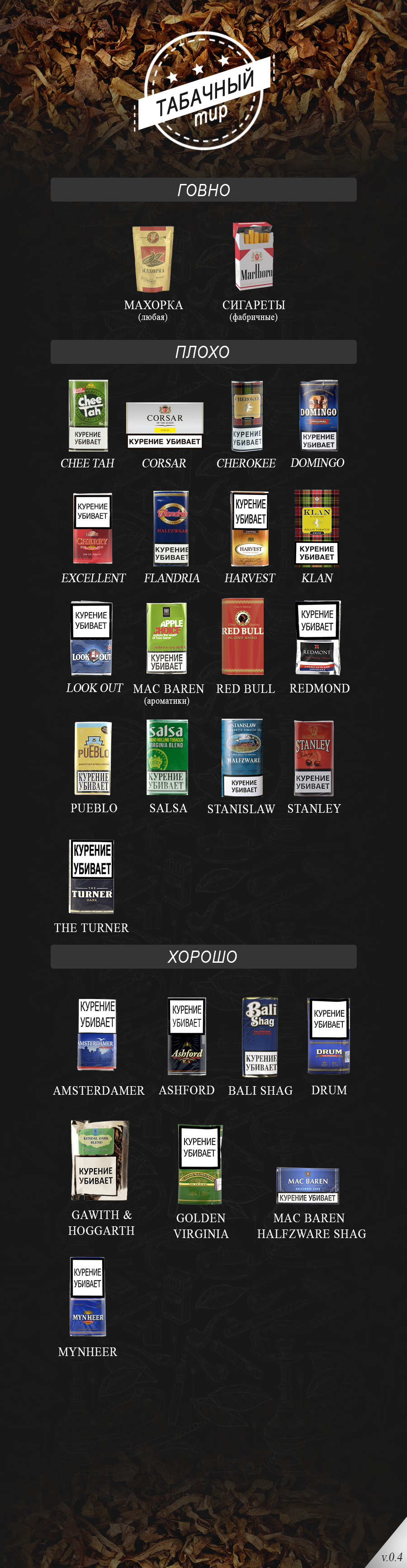 Пока так. Жду обратной связи анонов, может что-то вообще нужно удалить за неактуальность, что-то конкретизировать (типа один табак конкретного бренда норм, а другие говно). Так же интересует мнение по пепе, маниту, хаспек, драм, голден вирджиния.