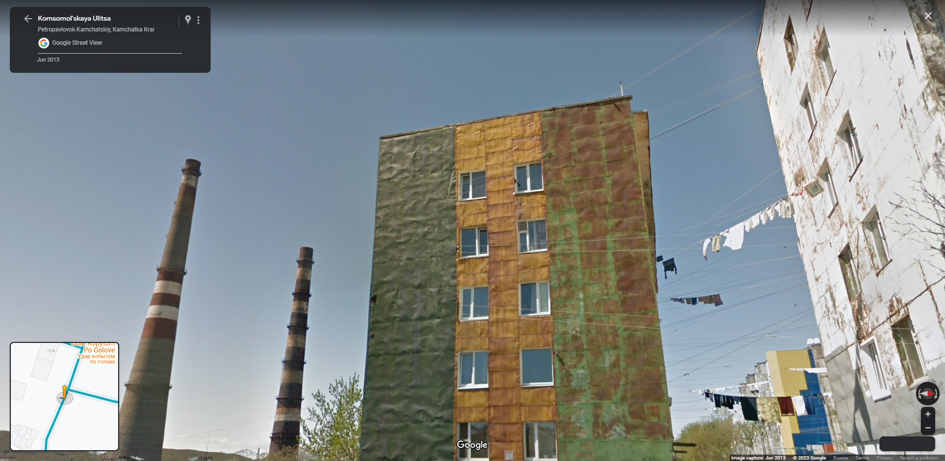 Почему дом облицован листами металла? Там что, нормальные стройматериалы не завозят? И как они так белье развешивают между домами, я вообще не понимаю.