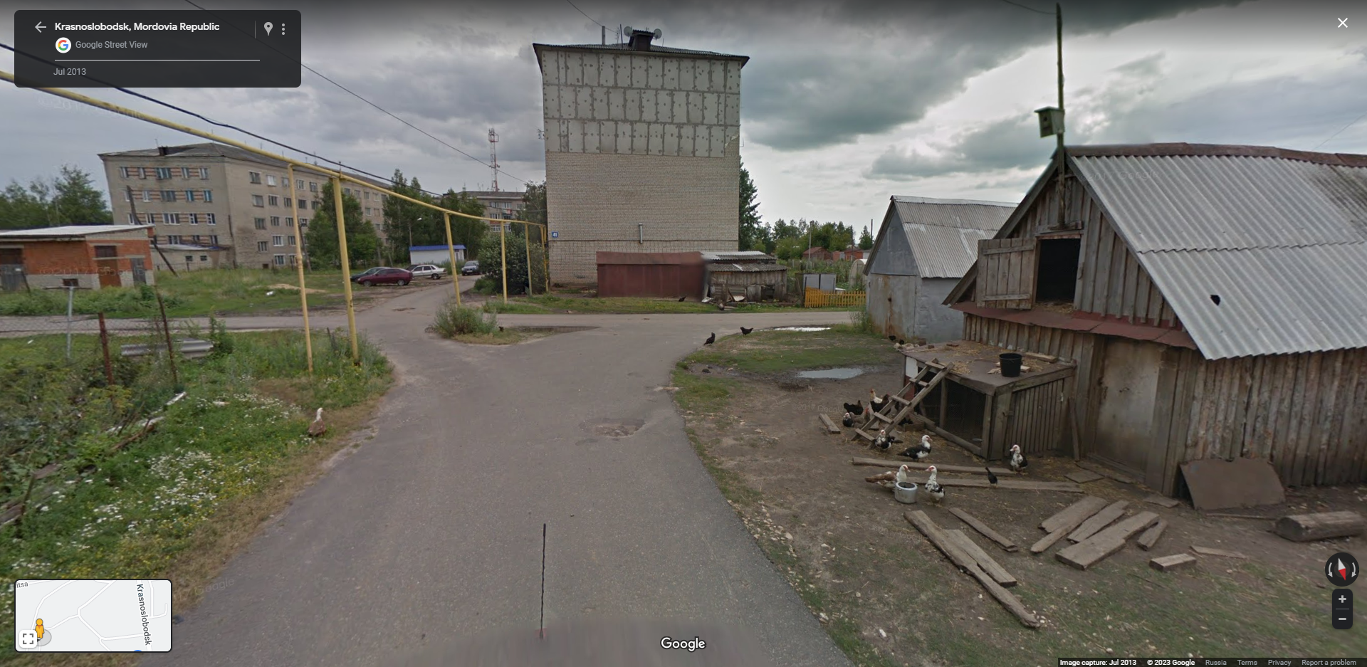 Интересная картина в Краснослободске, республика Мордовия. У чувака курятник в доме, находящемся в городской среде, и при этом нет никаких ограждений и заборов. Курочки просто бегают по району в свое удовольствие, и похоже их никто не трогает. А напротив располагается чей то парник с грядками, лепота.