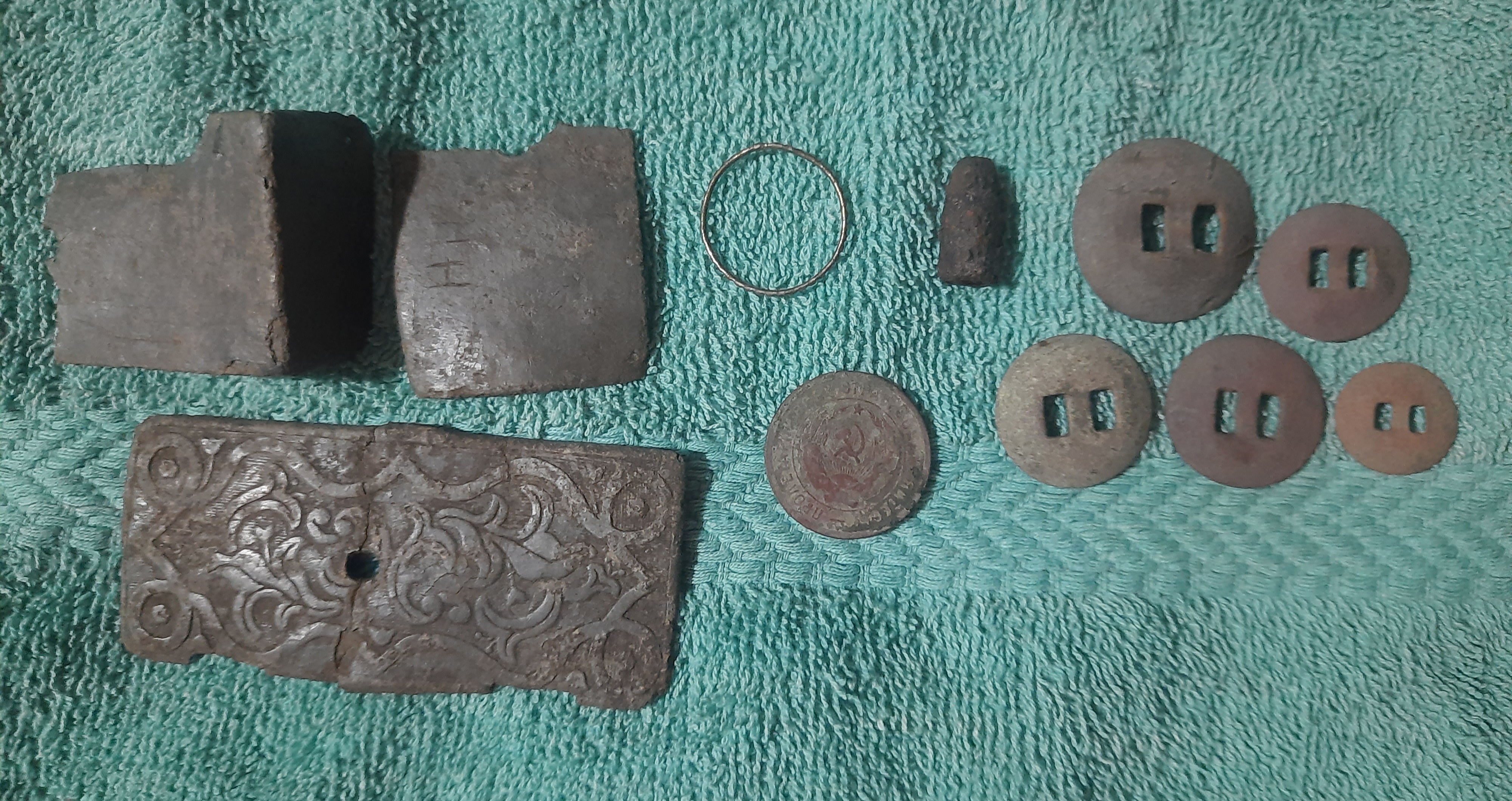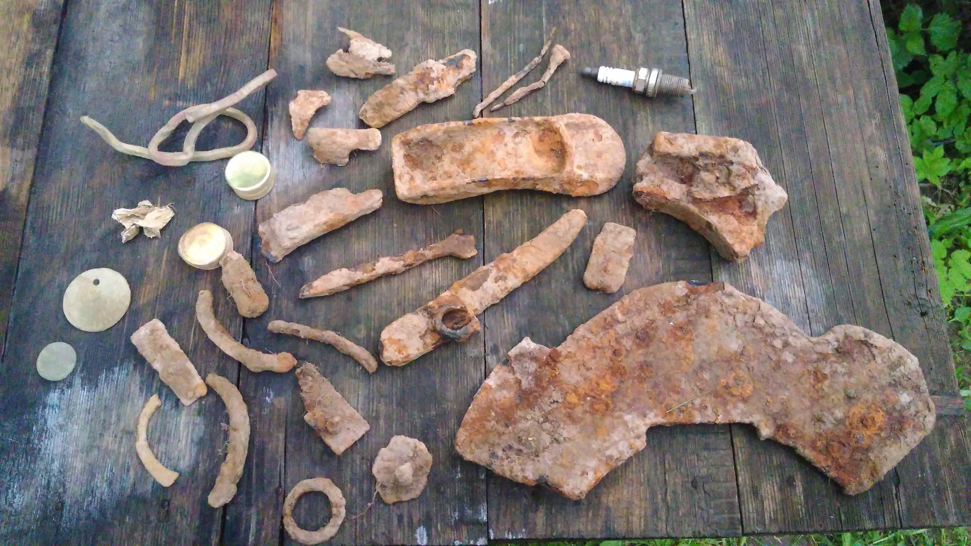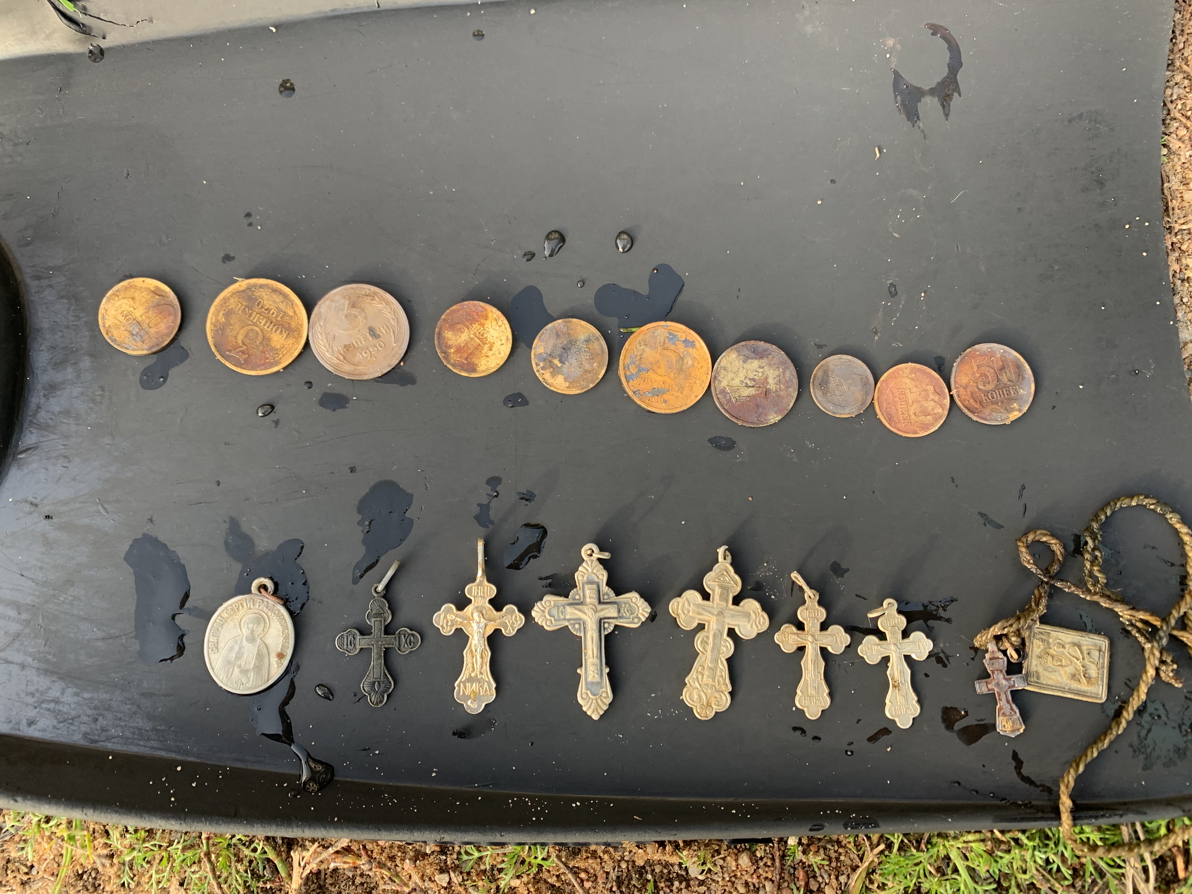 Ну я вот в треде все фото выше постил, вот общее сделал. Кресало 10-12 век(первая в жизни находка, вышло с первого сигнала), копейка 1904 года, два щитовика 1931 и 1932, копейки 50-х, пуговица довоенного телеграфа, серебряное колечко, крышка от шкатулки, старинный нательный образок, люверсы от царской военной палатки Циммер и Ковалев, пару торговых пломб(ни одной в сохране), пинцет для монпасье Абрикосов и сыновья, обломок большого крестика, обломок маленького крестика(на фото нет), части упряжи, два значка Олимпиада-80. Копал несколько дней. Сезон еще свой не окончил. Продолжу дома, на юге.