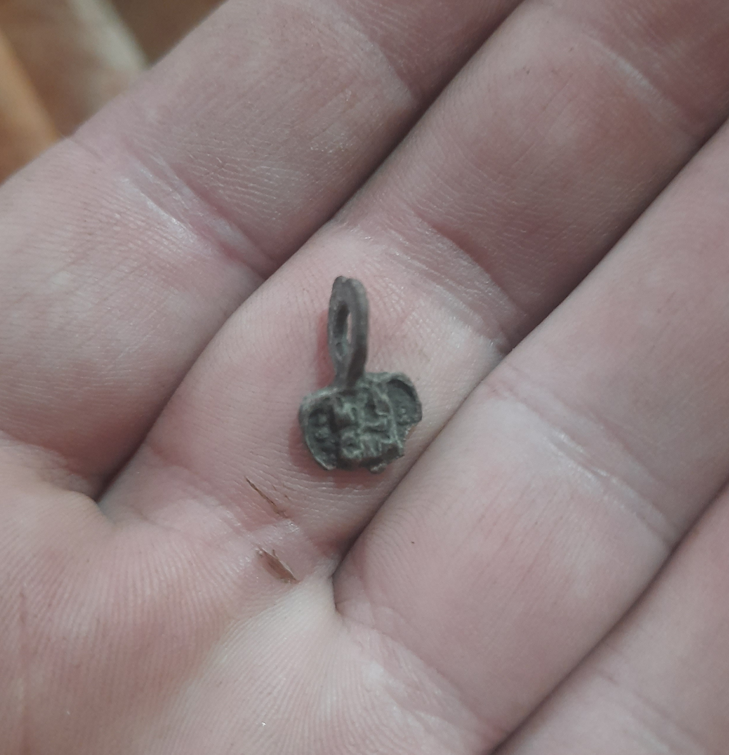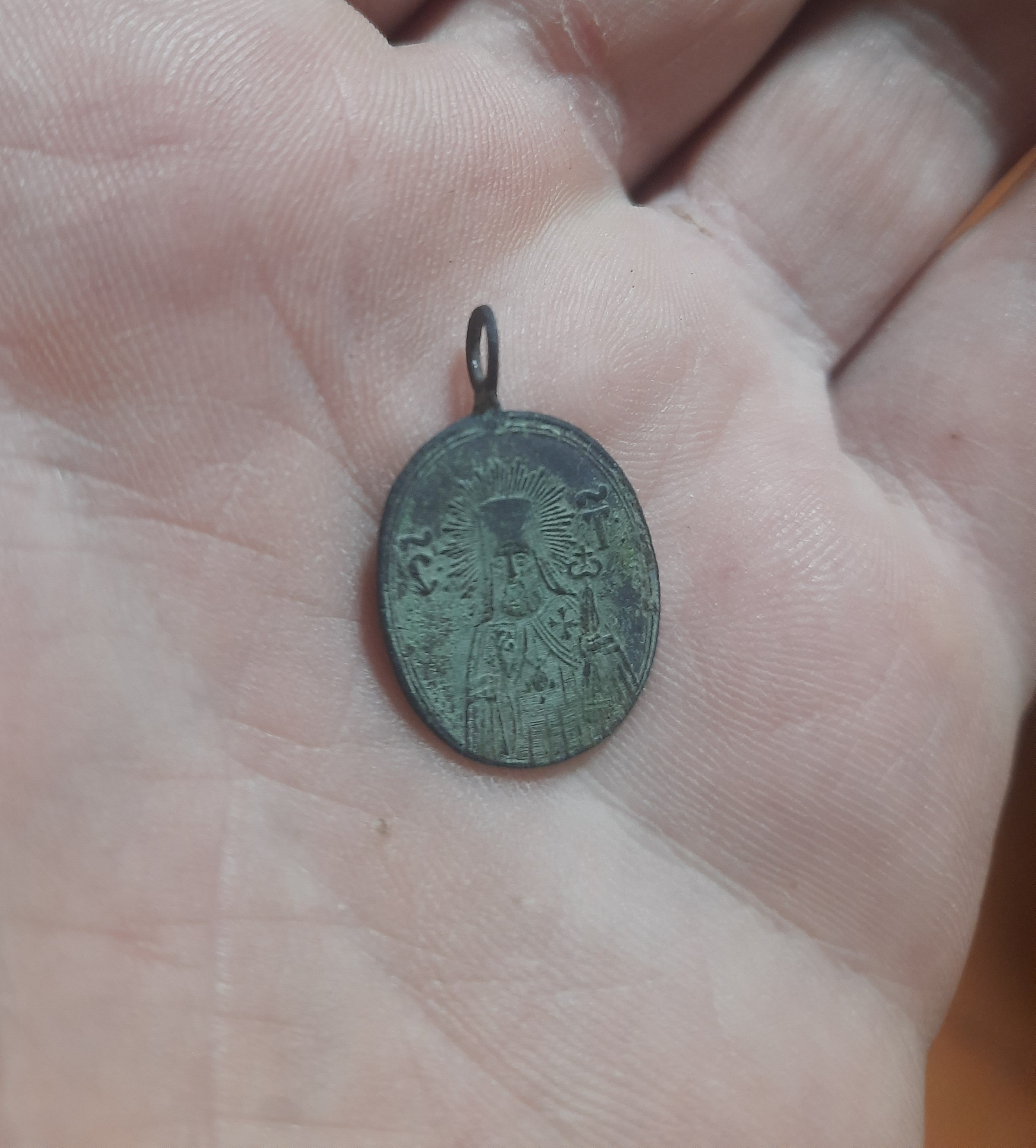 Сегодня пошел на новое поле. В течении часа вылез образок святителей Митрофана и Тихона. Также 2 копейки 1960-х и гнилая пуговица. На поле встречается керамика, стекло, кирпичи, наверное что-то было. Но опять же, где не приду, только маленькие находки, крупное явно собрали до меня.