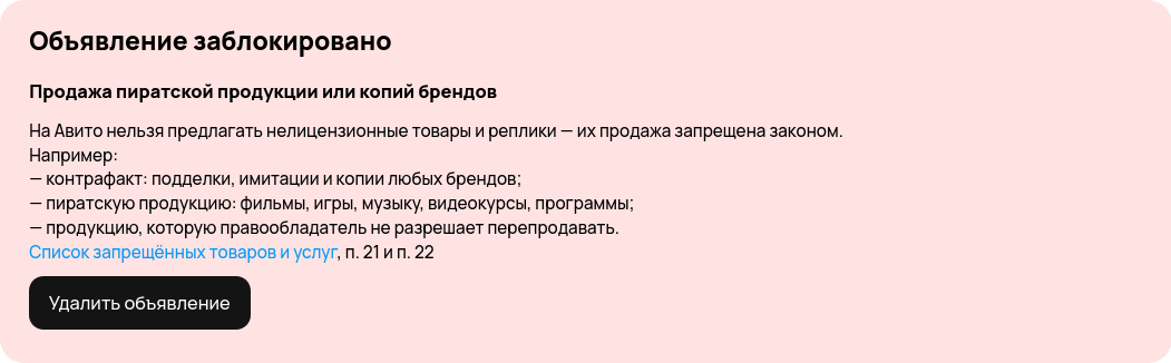 Авитопомойка полностью ебанулась. Заблокировали мне объявление о продаже старых картриджей на сегу. Просто пиздец. Причём я много раз продавал картриджи (да и другие продают), и не было никаких проблем.