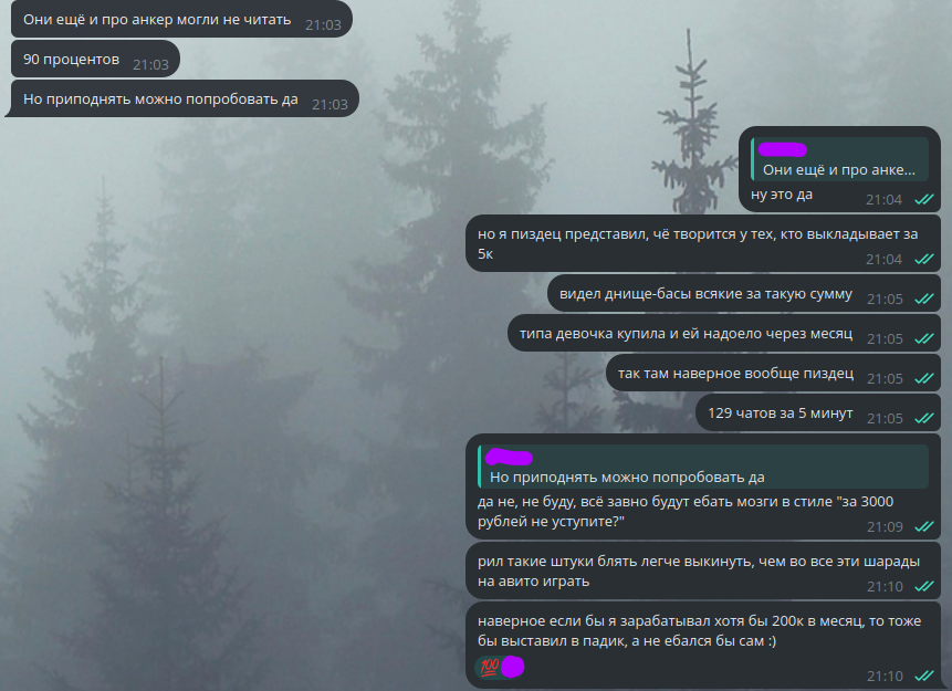 9. Продавал дорогой ноут. Написала девушка, профиль с фото, голосовые в чате тоже записаны женским голосом, на генерацию нейронкой непохоже. Назначили встречу в ТЦ, где я кушаю в обеденный перерыв. Сижу, жду. Пишет, что никак не может припарковаться. В тот день реально было очень много машин + авария на выезде. Предлагает встретиться в парке через дорогу, даже кидает фотографию места, где она меня "ждет". И вот тут я все понял. Во-первых, я прекрасно знаю этот парк, и это не парк, а часть бывшей промзоны, которую облагородили. Во-вторых, та часть парка, в которой она меня якобы ждёт, это глухой тупик, так как главный вход находится с другой стороны дороги, то есть в случае чего свидетелей там нет. А попасть со стороны ТЦ туда можно только если перелезть через 1.5м заборчик, то есть точно не случайно. В-третьих, если до этого в основном были 50/50 голосовые сообщения, то перед непосредственно встречей она начала писать текстом, что нелогично, ведь она якобы за рулём. В общем, я написал, что уже нет времени и ушел на работу, а сам начал перешёл в другое крыло ТЦ, где окна выходили на эту часть парка. Я понимаю, что вы щас подумаете, что я шиз и просто накручиваю, но где-то через 4 минуты, как я сказал, что не приду, через забор со стороны парка перелезли два спортика, сели в недалеко припаркованный таз и уехали. Больше "покупательница" мне не писала, сообщения мои не открывала. Автарка из профиля исчезла.