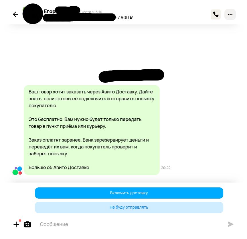 И началось: что токе СПБ не знаю, телефон не дам да еще и название банка ужос давайте по номеру карты. Хорошо говорю отправляю а вы поставьте заказ 100 р и включите АВИТО ДОСТАВКУ. Ой нет неудобно давайте я так отправлю. Ладно думаю переведу деньги разберемся с доставкой если что докину ебанашке.