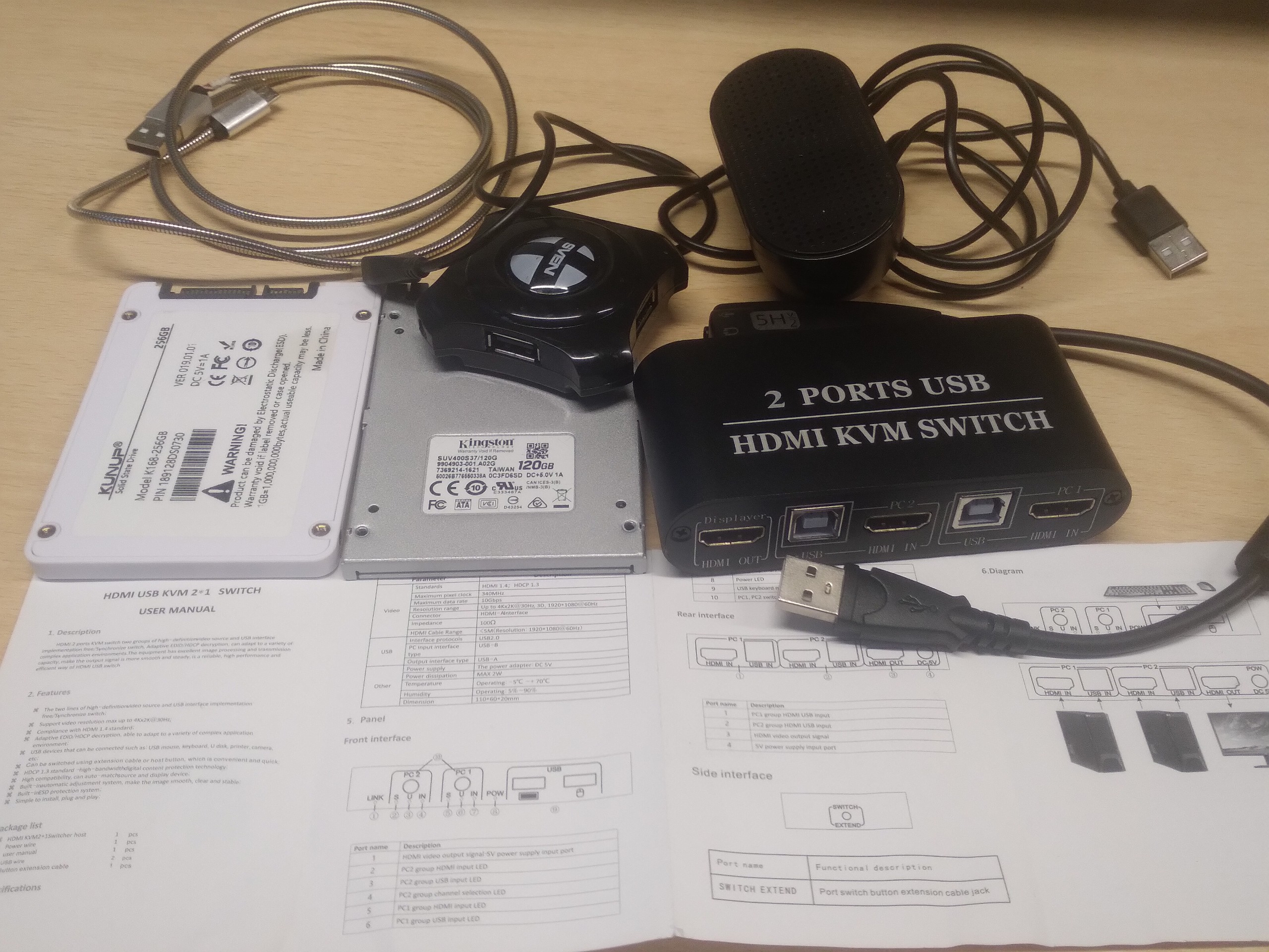 Какой-то вынос интересный. Усб колонка, усб аудио, хаб. Какой переключатель видео и два ссд. Видимо устарело всё. Ссд сейчас маленькие, аудио через блютуз. 120 гигов стоят мало. Время летит.