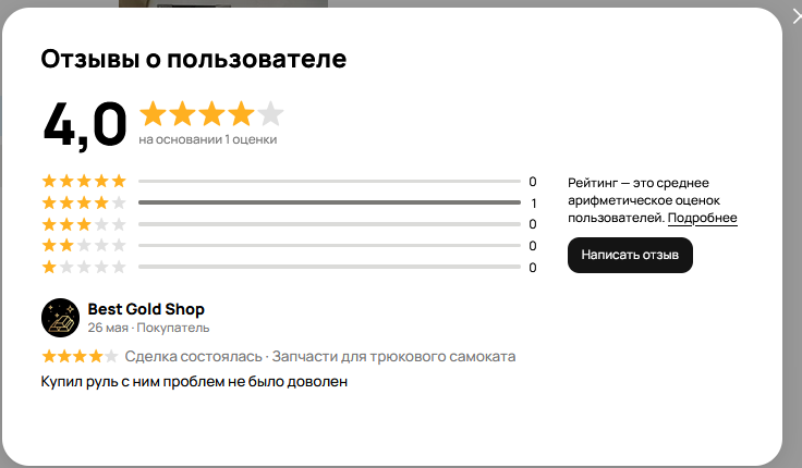 >Твоя оценка глобально ни на что не влияет, т.к. любой адекватный покупатель не просто смотрит на рейтинг (если он ему так важен), а потратит минуту на чтение негативных отзывом. Вообще похуй что там дальше у него будет, главное получить моральное удовлетворение за месть за игнор у меня вьетнамские флешбеки после сайтов знакомств >И еще, продавец может такие отзывы обжаловать, и они перейдут в отзывы без оценки, т.к. сделки и встречи не было Ну ты прям Америку открываешь! К слову, 80% этого не делают, что говорит об интеллектуальном развитии игнорщиков.