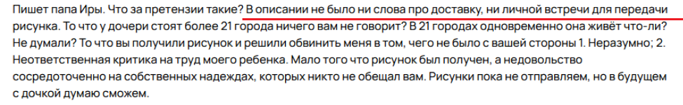 Ещё пример конченого пидораса. То есть у нашего ОХУЕННО ЗАНЯТОГО деятеля "хватило времени" на то чтобы зайти на сайт/в приложение, тыкнуть в переписку и прочитать... а на ответ, видите ли, не хватило. Бедненький, как же он найдёт время отдать/отправить товар. Особенно орейро что такие "занятые" обычно чуть ли не каждые полчаса в сети.