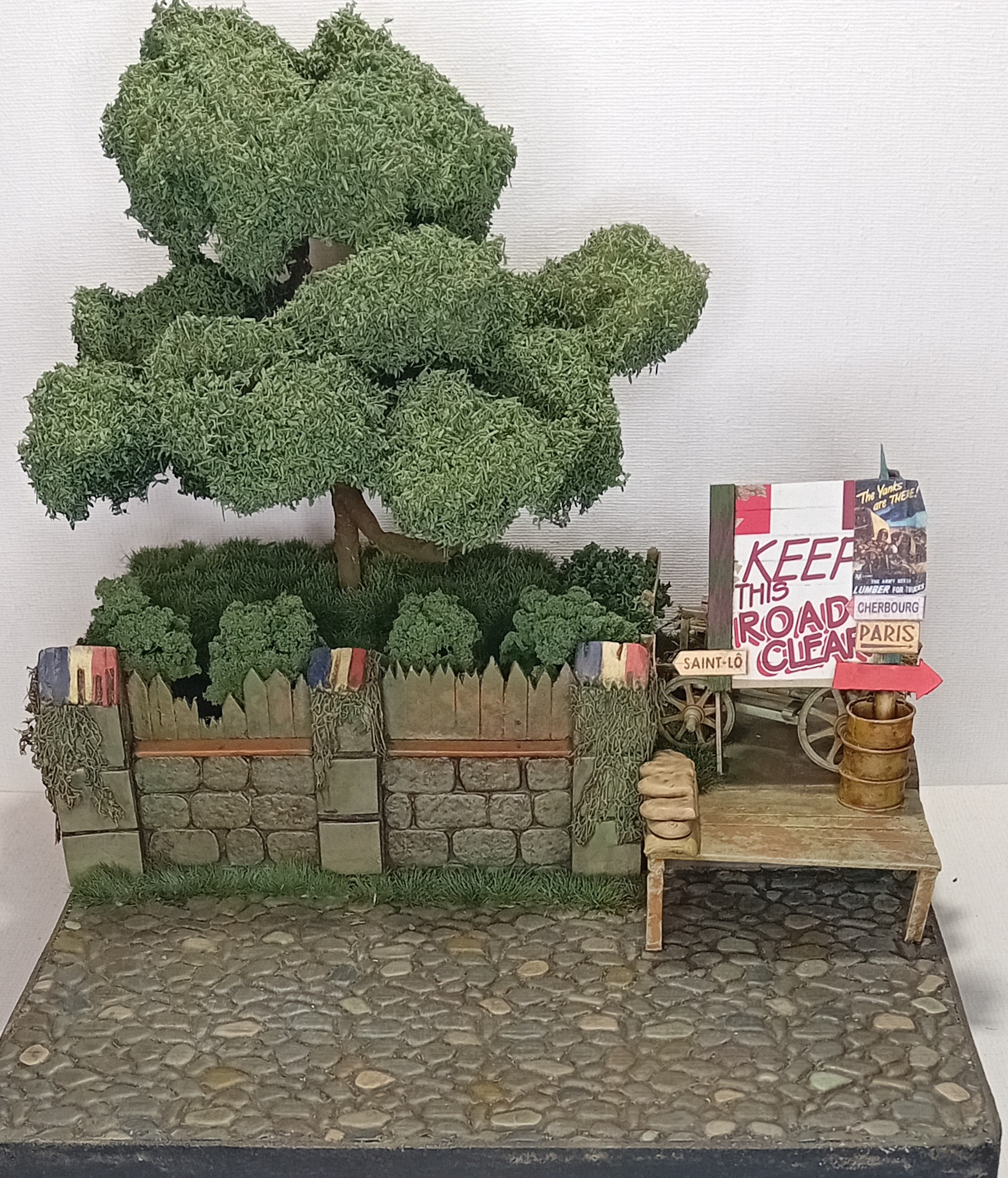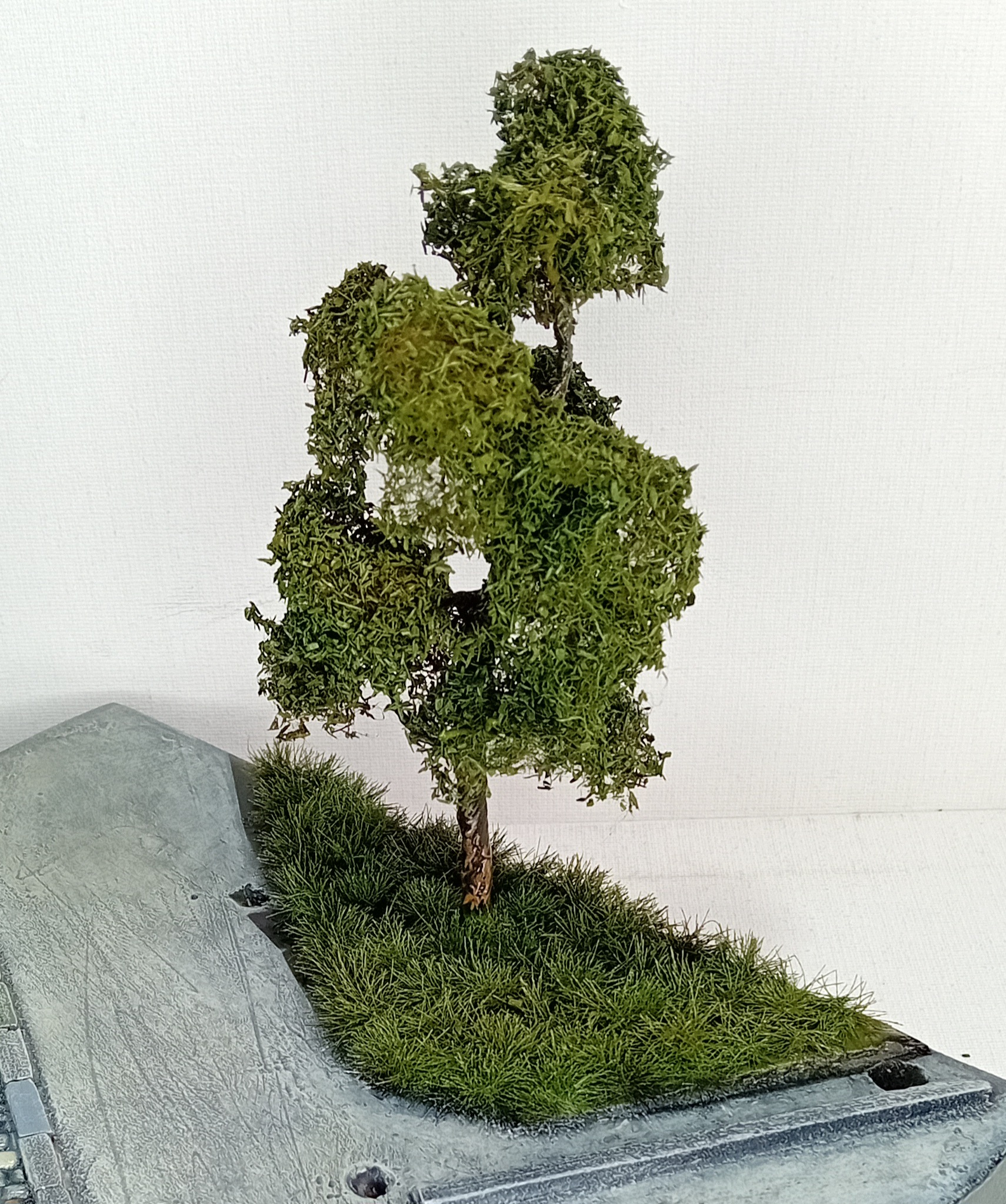 Фильтр высох и зона заднего двора готова к высадке дерева и травы. Трава покупная по 370р от артбазы, а дерево я изготовил сам. Вопрос: зачем я так подробно красил землю, если все засадил травой? Объясняю, мне важно осваивать и тренировать навыки, в следующей диораме может не быть травы, а навык создания землянного грунта понадобится, вот я его лишний раз потренировал.