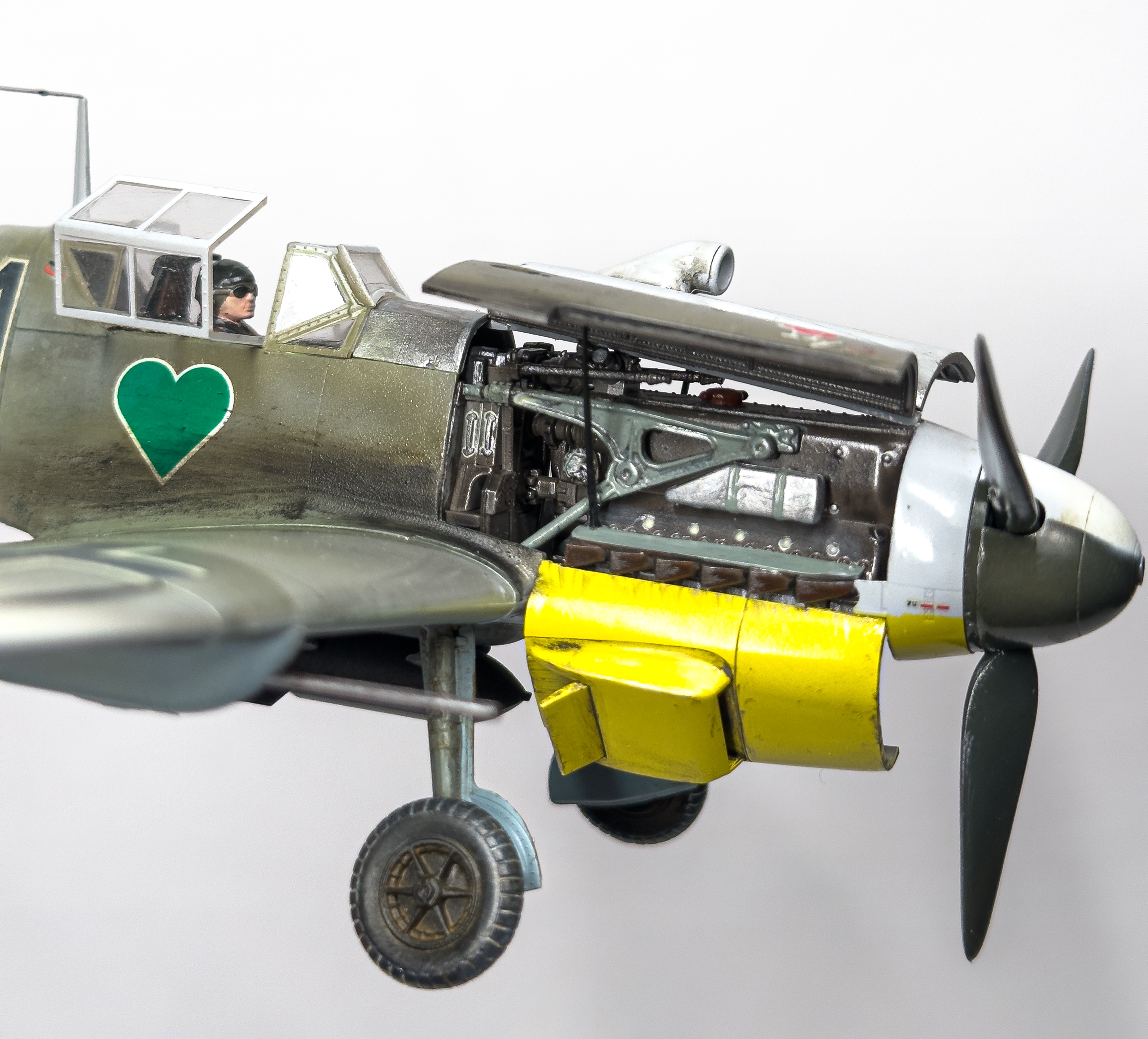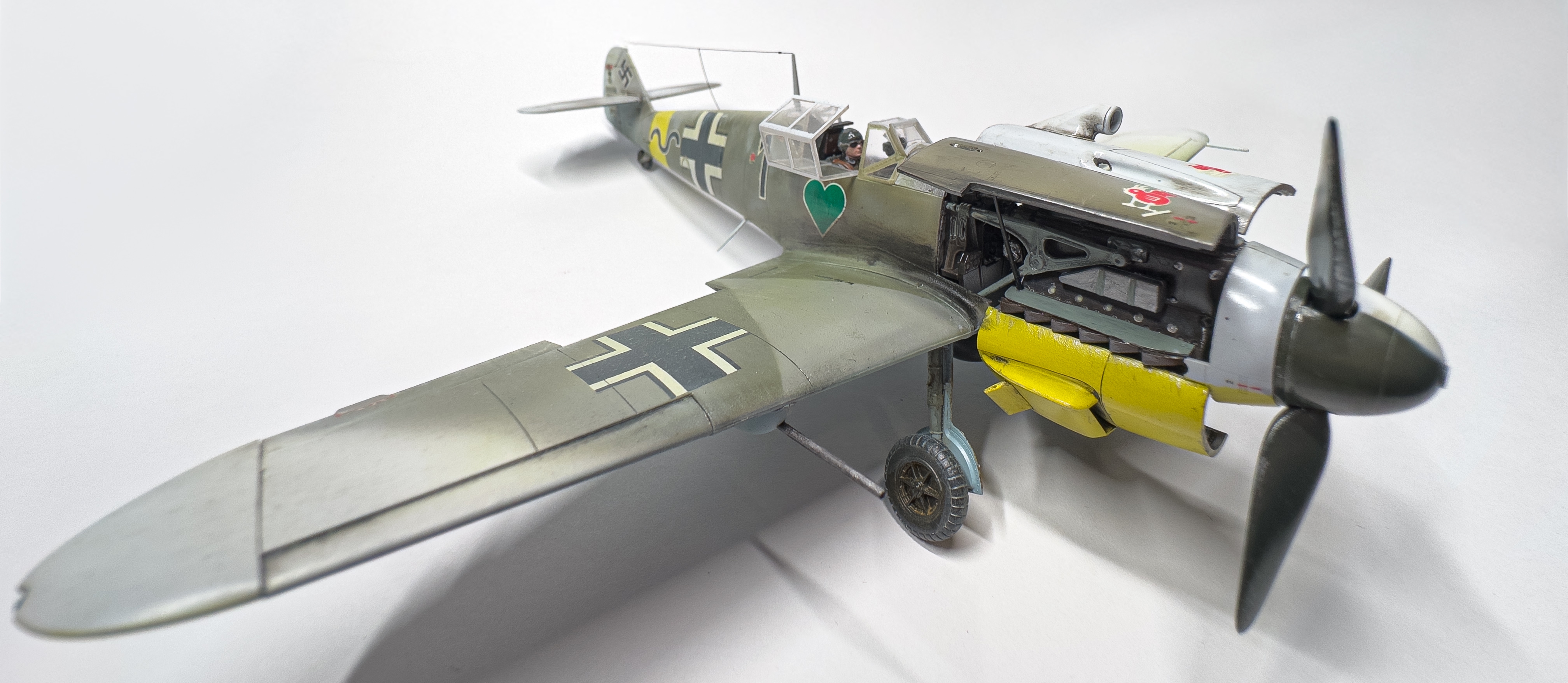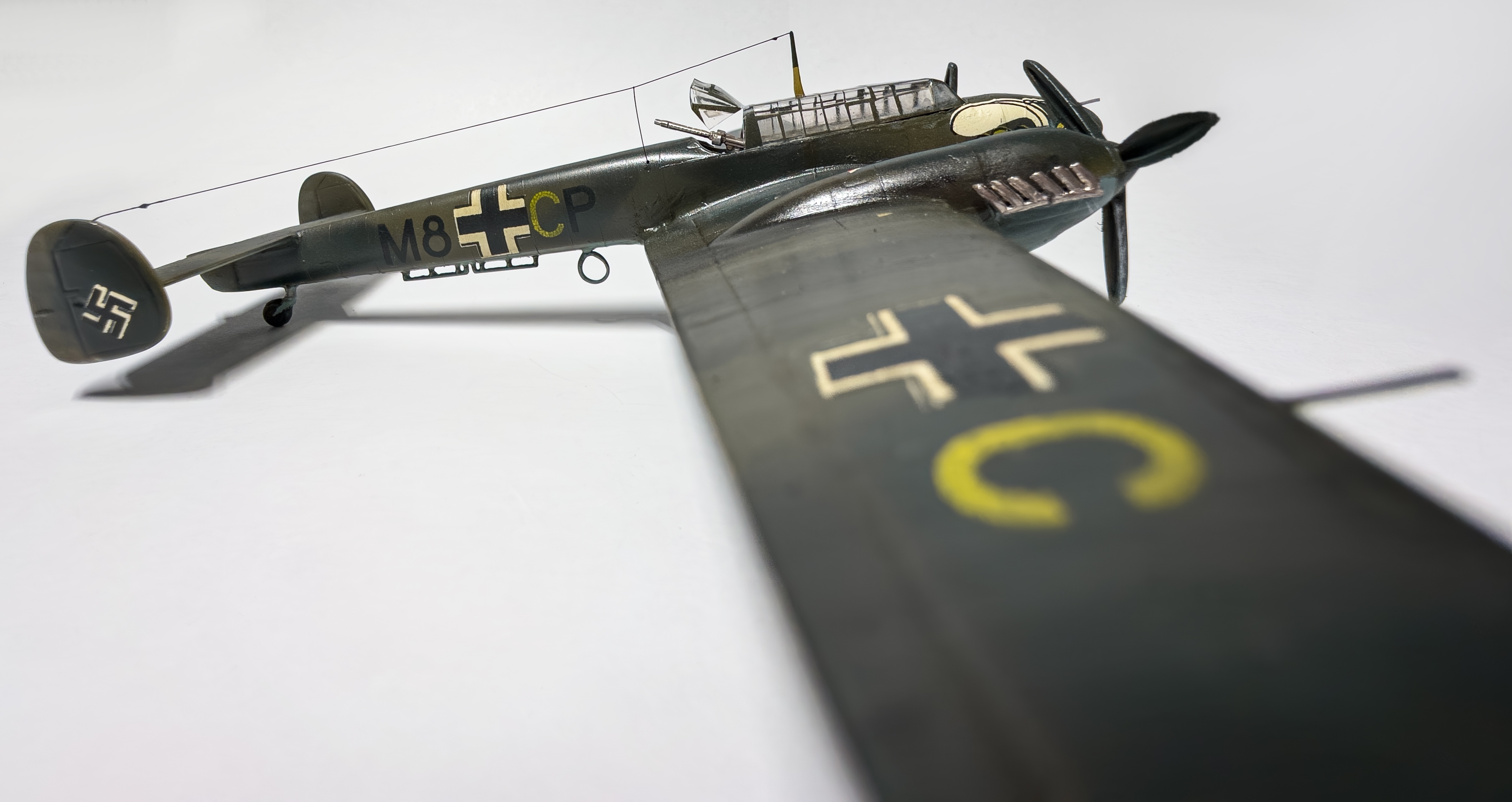 что-то тред совсем омертвел по сравнению с зимой. разбавлю своей третьей моделькой. покрас испорчен, зато я узнал, что на шагренистой поверхности делать масляные точки и смывку занятие не очень разумное, так как излишки убрать потом очень сложно. удивился, как смог сделать аккуратно антенны из тонкой лески, изоляторы делал пытаясь накрутить с палочки каплю суперклея, было неудобно. потом прочитал, что лучше попробовать клей пва. фонарь кабины окунал в футуры, давал просохнуть сутки и снова окунул. стал чище, но я пго испортил серой шпаклёвкой от тамии. мне пришдо в голову приложить фонарь, а неровности между ним и фюзеляжем закрыть шпаклёвкой, я подумал водой смою с фонаря, но не тут то было. в принципе прогресс какой никакой есть. КСТАТИ. палочку, нижняя половина которой деревяннная dunkelgelb от джим скейла я приклеил на супер клей. и никаких помутнений от него. да что скрывать, я фонарь в двух местах вообще на него приклеил, так как его пришлось сжать по бокам. похоже реально футура даёт защиту от помутнений от цианокрилата. но может я был настолько аккуратен.. снизу слишком большой нагар получился что-то, это большой минус для меня. ну и к вакуумным моделям я больше не прикоснусь. сейчас начал звездовский pz4h 1/72, хоть и есть проблемы со стыкуемостью небольшие, всё равно намного приятнее, чем точить каждую деталь и подгонять друг к другу. а ну и я испортил две декали, на этом номере M8CP должна быть акулья морда, но я их испортил в силу чуть неправильных размеров видимо фюзеляжа, так что пришлось заюзать пчелу. а декаль настолько качественная, что когда я её снимал с подложки, почти весь цвет остался на ней, и вместе жёлтого получился бледноватый. металлические детали не подкрашивал, так как это "фишечка" модели. в конце скажу, что впервые начал что-то делать из литников. тут это: нижняя кольцеобразная антенна накрутил гретый тонкий литник на кисточку, а кольцо сделал, расплавив клеем концы, антенна с конусом на конце, треугольничек возле колеса, палочка на фонаре кабины, пулемёты, трубка пито, которую я 3 раза ломал в силу неаккуратности