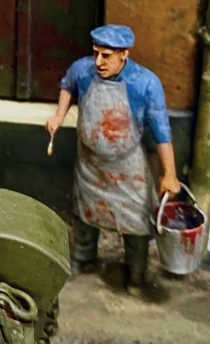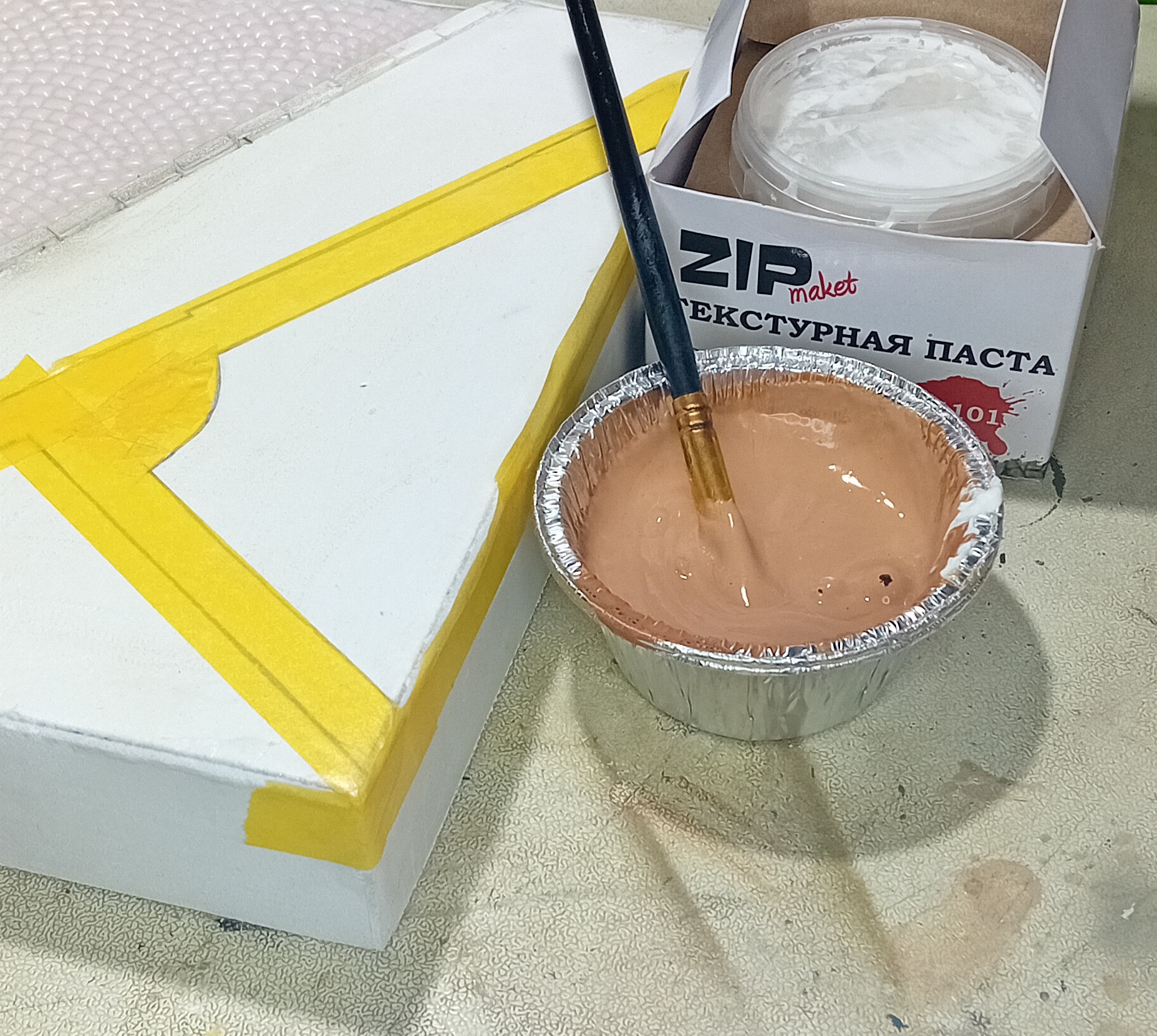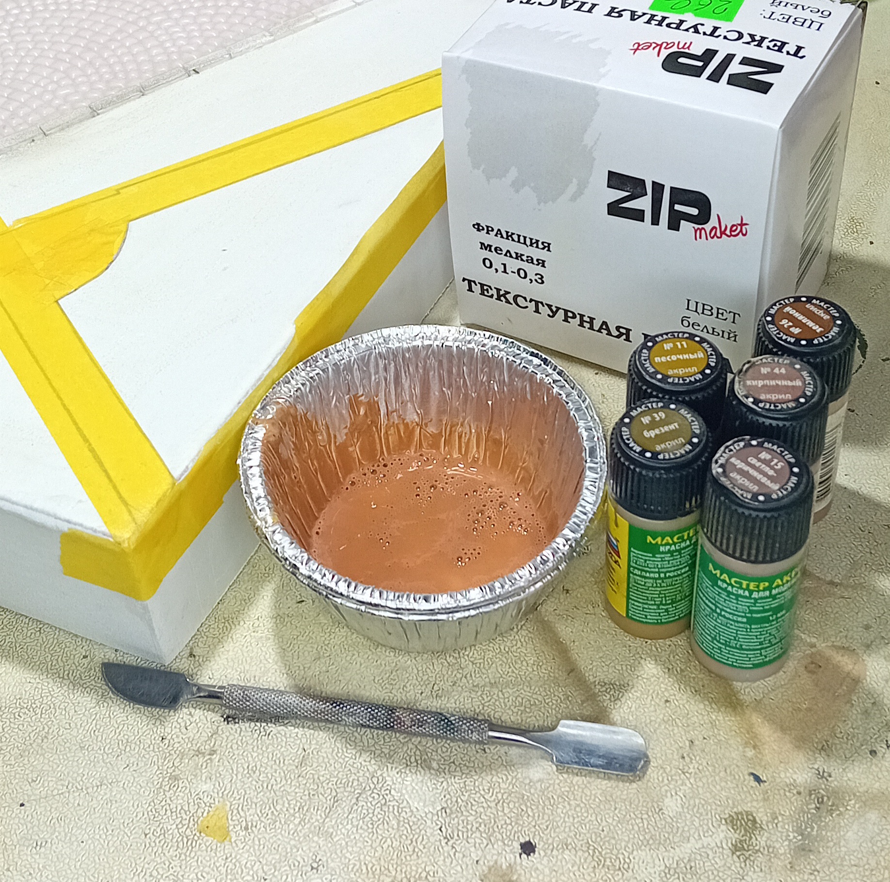 >>808021 Я буду тут по возможности выкладывать процесс. Вот например формирование грунта во дворе. 1. Ограничить зону нанесения масклентой 2. Смешать звёздовский (его не жалко) акрил в земельный цвет 3. Помешать две ложки пасты в краску 4. Нанести широкой кистью на поверхность 5. Обсыпать смесью модельного песка и очень мелкой гальки 6. Покрыть поверхностью смесь 50 на 50 пва/вода Оставить сохнуть на ночь, после высыхания покрасить аэрографом в подходящий диораме цвет.