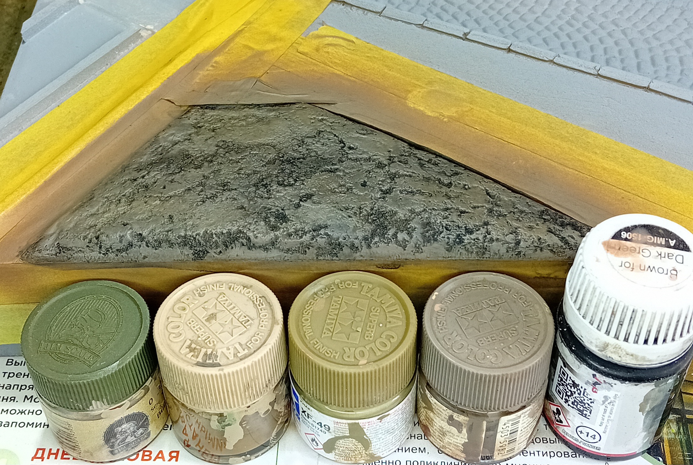 Продолжаю работу над своей диорамой. Задний двор высох, добавляют немного земельных пигментов для придания рельефа, закрепляю пигмент вайт-спиритом. Жду высыхания. После высыхания пигментов я грунтую задний двор серой модельной грунтовкой из баллона (вместе со всей остальной диорамой). Ограждаю зону покраски маскировочной лентой и выбираю 3-4 цвета (земля тёмная, земля светлая, пыль, хаки) и готовлю чёрный фильтр собственного изготовления. Как только краска высохла, сразу, без дополнительных манипуляций наношу широкой кистью фильтр. Получается интересная, рельефная почва, оставляю все сохнуть на два часа.