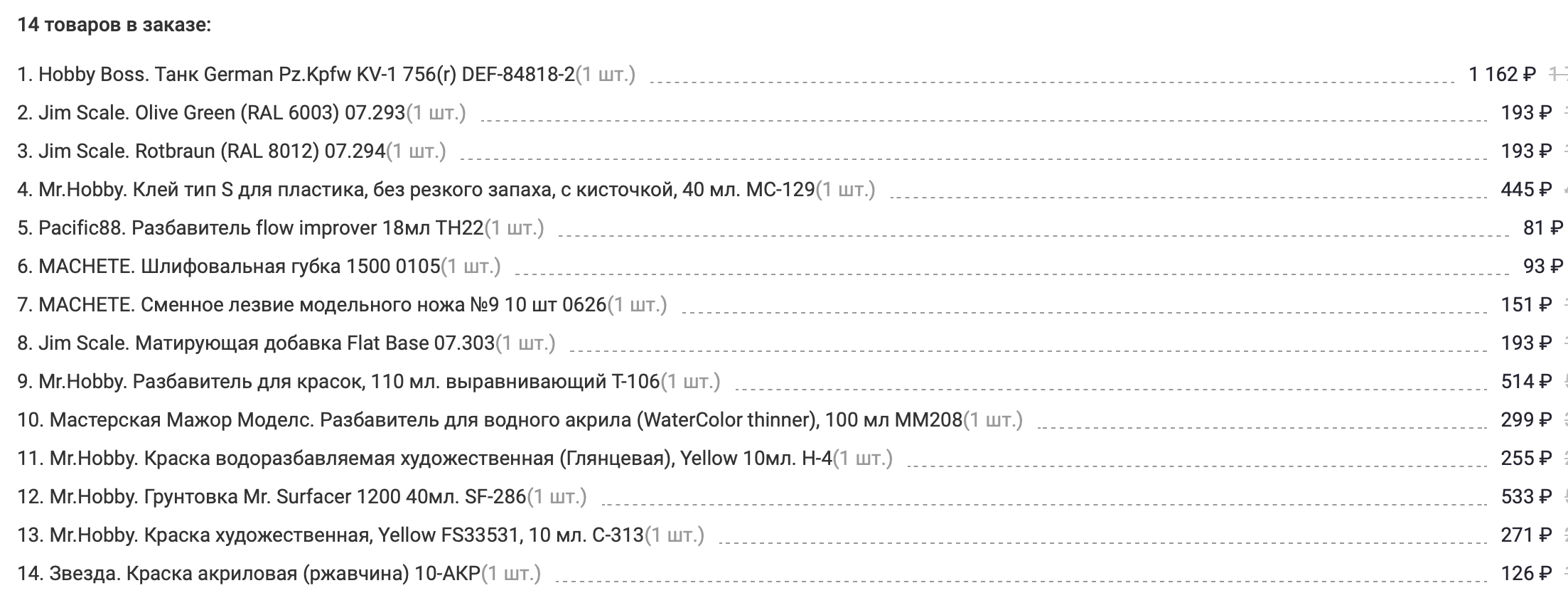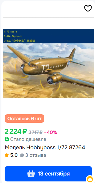 Пока шерстил интернет наткнулся на Тояму. Вроде качество/цена чуть ли не лучшее на рынке. Так они еще 20% скидку дают за 20тыр покупки. Что-то собрал под миниатюру, а сейчас думаю накой мне мопед за 1400, когда Звезда по 500 колясочные раздает. Придется всю корзину пересобирать теперь.