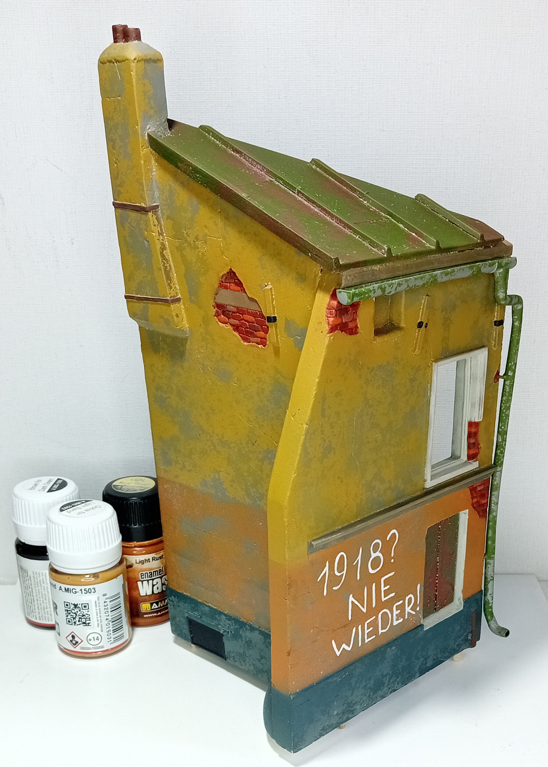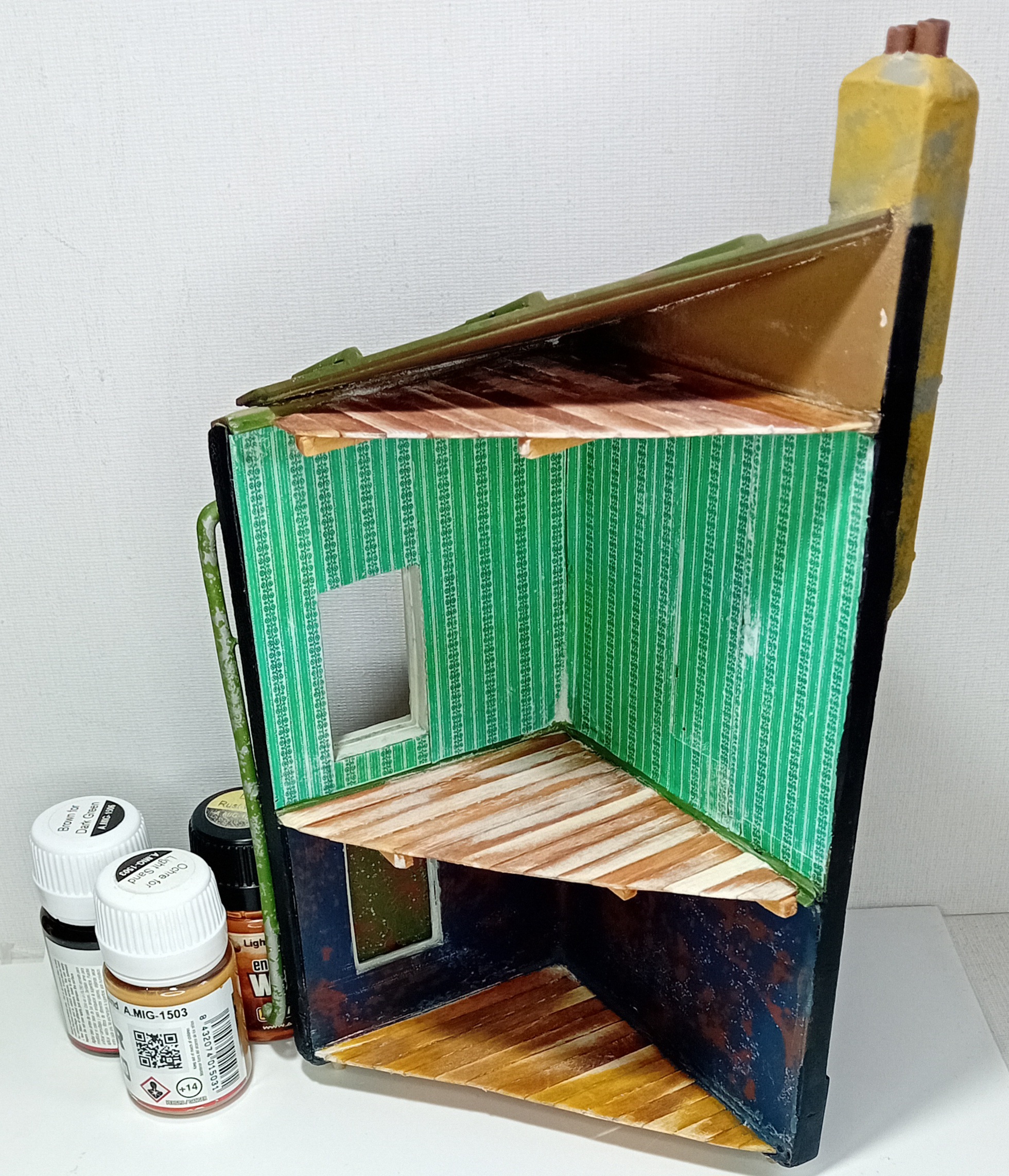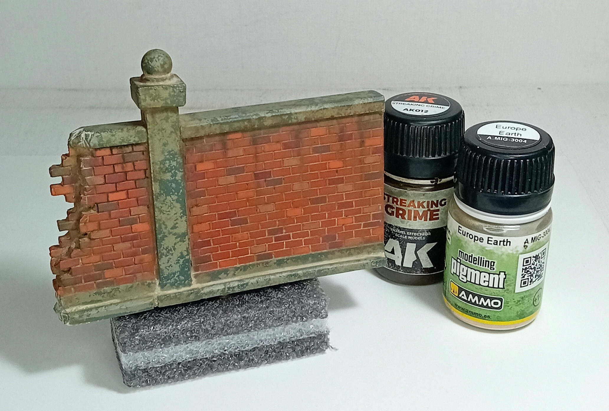 Продолжаем строить диораму, на этот раз контент с домом и забором. Пока только окрасил акрилом и слегка припылил пространство между кирпичами пигментами.