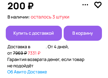 >>820317 Нихуя себе, 600 р за товар стоимостью в 200. Вот у меня такая же ситуация была, два покупана отказались оформлять, т.к. доставка дорогая (хотя товары были сами дорогие, на их фоне доставка выглядит адекватно). Я сам ни разу на авито не заказывал, но заметил, что иногда предлагают доставку за 1 р. Интересно, это единоразовая хуйня или регулярно по 1 рублю бывает