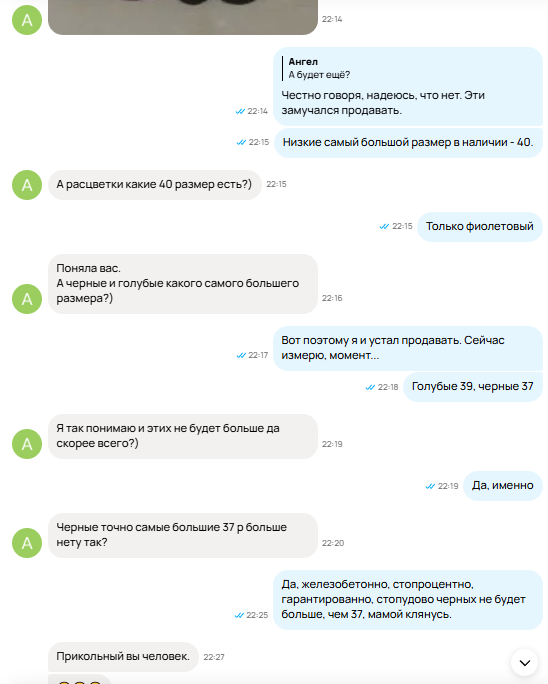 Блять, я ебал. Пишет девка: "ой а я хочу заказать у вас %пердола нейм%, но у той объявы доставка дорогая, давайте на этой закажу". Я согласился, мне похуй где закажет. Сказал, что щас цену поменяю - и пускай оформляет. И в итоге девка молча заказала на той объяве, где "доставка дороже", а почему? Потому что там цена ниже стоит (разная стоимость товаров ебать). Не оценил прикола, отменил заказ, жду 1 звезду.