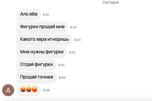 Пиздец у меня горит жопа Всё, перестаю быть адекватным покупахой, который сначала спрашивает и уточняет, а потом уже заказывает доставку, и буду тем долбоебом, который просто тыкает, а потом, если что - не забирает или отказывается. Какой раз уже ситуация, что пишешь челу, ведёшь диалог, договариваешься о доставке, а в это время какое то хуйло выкупает и чел ПРОСТО СЛИВАЕТСЯ НАХУЙ, когда пишешь, что вот я же буквально заказываю у вас и писал вам - ОЙ НУ УЖЕ ЗАКАЗАЛИ, ЧТО ТЕПЕРЬ ОТМЕНЯТЬ ЧТО-ЛИ??? Идите нахуй просто