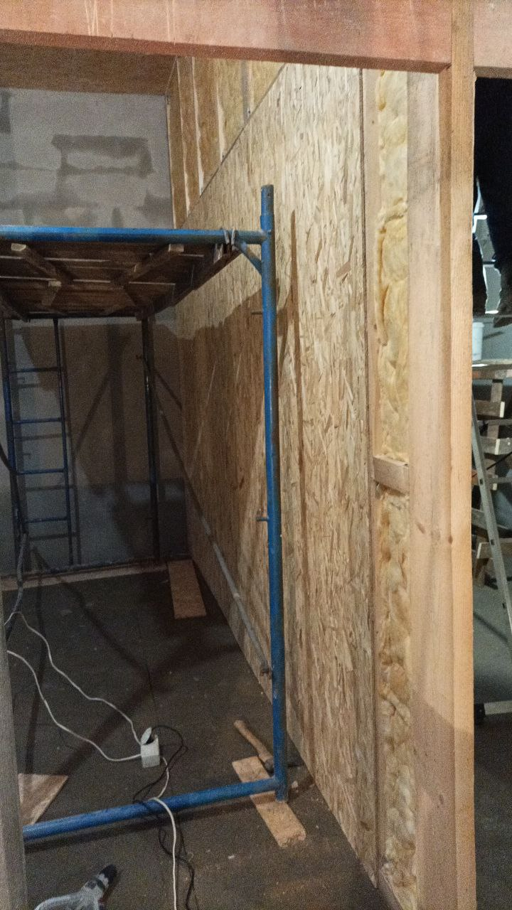 Гаражные ворота успешно заделал. Думаю снаружи зашить нищуковским профнастилом, потому что штукатурка на осб — такое себе, при контакте с влагой держаться особо не будет. Внутри осталось пароизоляцию накинуть и гкл закрыть — и всё.
