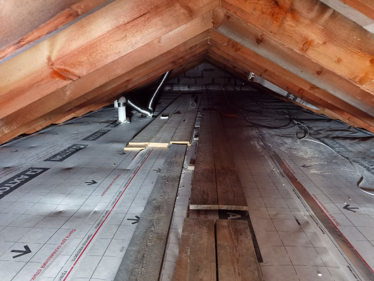 Установил пять подоконников, доложил перегородку до конца. Жена начала штукатурить изнутри, а я готовлюсь всё запенить на выходных, зашить стык крыши и стен, заложив туда утеплитель, разметить место для установки слухового окна и приготовиться к монтажу вентиляции и снегоудержателей на кровлю. И водосточных труб.