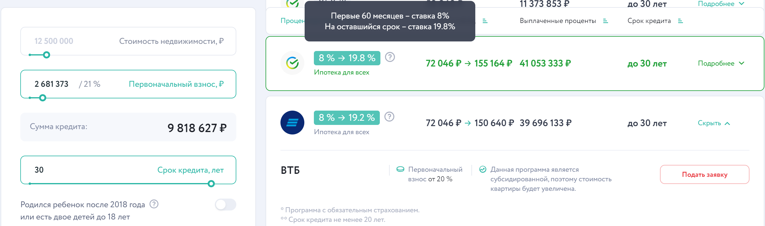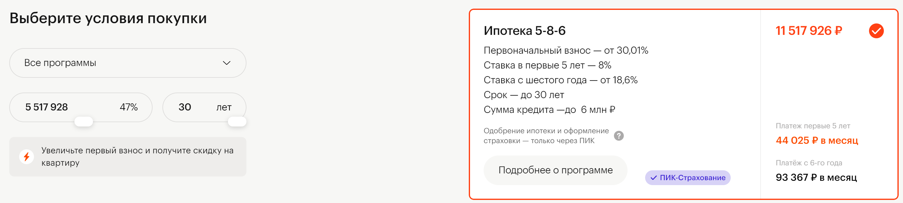 Есть программа 5-8-6 (первые 5 лет ставка 8%, дальше - 18). Но мне на сайте даёт делать рандомный взнос 45-70% в зависимости от хаты.
