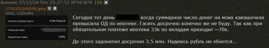 >>350734 Валидное замечание. Но когда в 2021 брал ипотеку зарплата было ровно 200к на руки. Долго копил на первоначальный взнос. Удалось накопить 2.5 млн это за 3 года. К слову в 2018 зарплата была 90к. Вклады тогда были под 4%. Длительно копить не было причины. Единственное о чем сейчас немного жалею, надо было докинуть 2-3 млн и взять трешку, но тогда мне казалось это рискованным, ибо надо было взять часть ПВ в кредит.