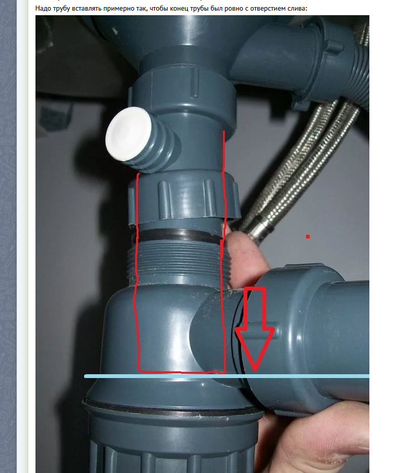 Нужно ли основную трубу (пометил на пике1) вставлять до уровня отводящей трубы? Или достаточно на полшишечки закрутить? Уронил в раковину банку и весь нижний стакан слетел нахуй, а как было и не помню. В гугле (пик 2) показывают что надо так