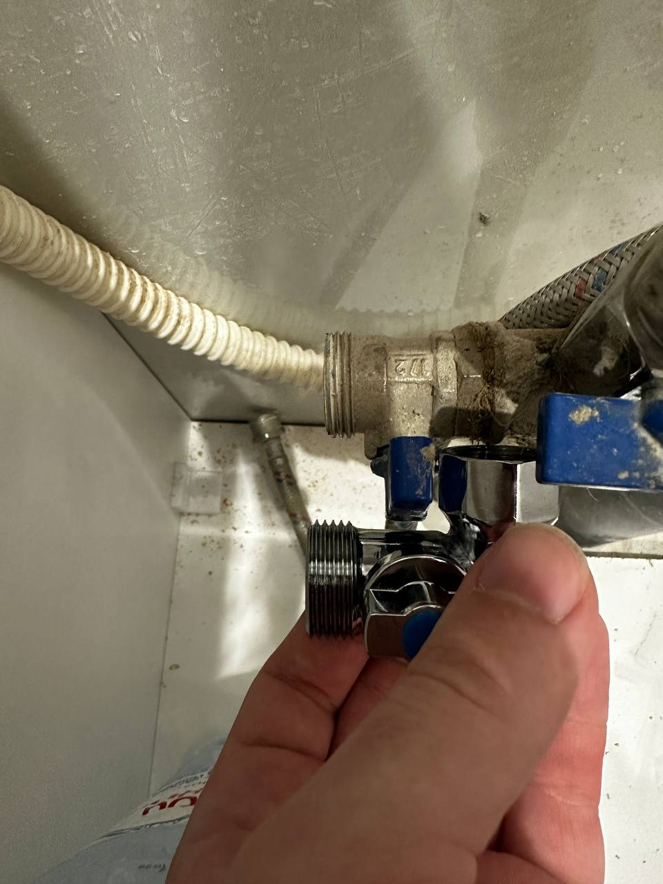 Кстати, еще заметил, что вот эта синяя труба с холодной водой(в доме только холодная вода, нагревается котлом, который в отдельном помещении на кухне), покрывается конденсатом если жарко(после приема ванны такое). Это же норма зимой?
