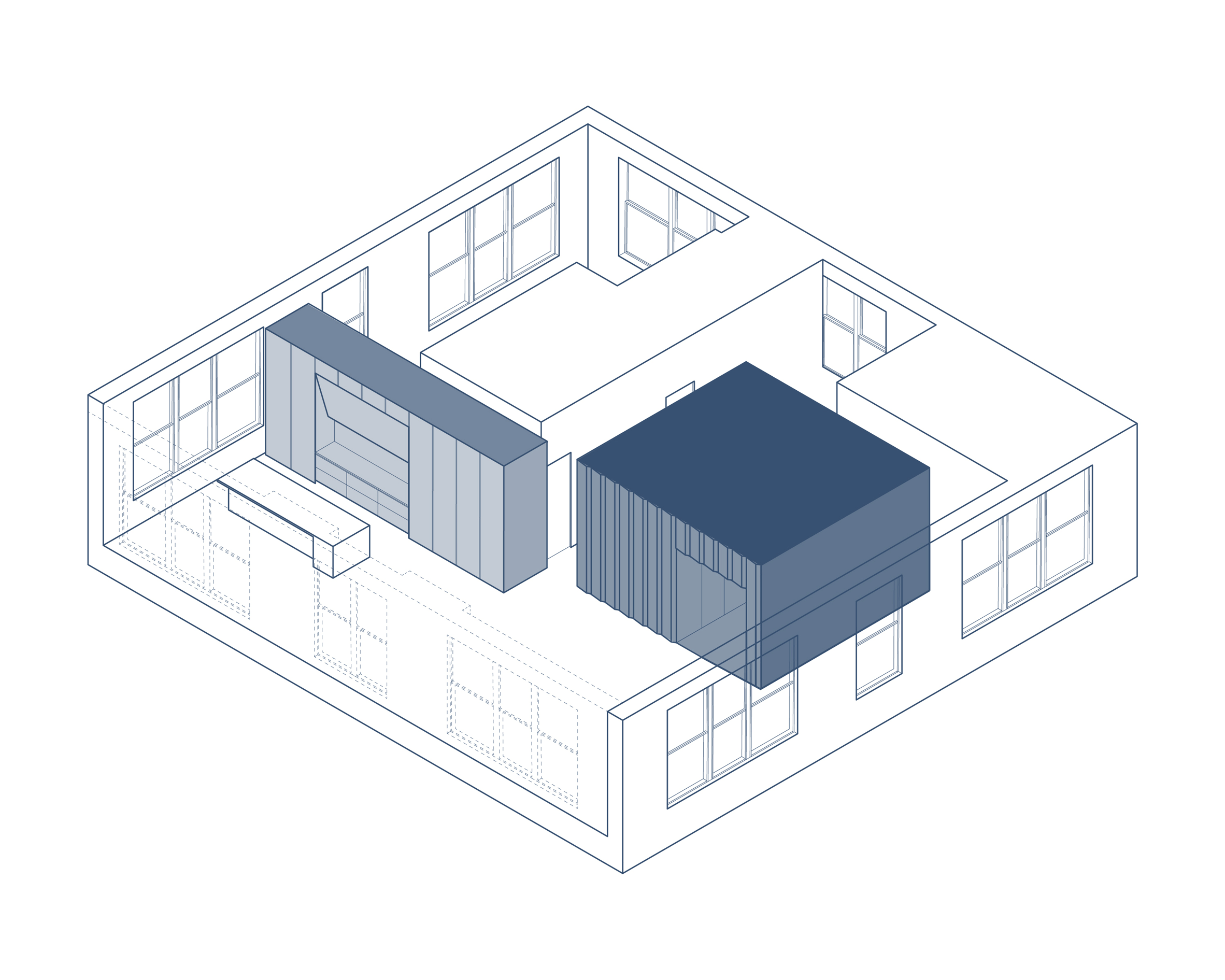 А потому в небольшую комнату выносится библиотека. Которой бы по-хорошему быть кабинетом, но детям с родителями надо видеться где-то, кроме как за обеденным столом.
