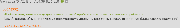 >>361223 >Я объяснил, почему у дедов было только 2 пробки и при этом все олтично работало. Так. А теперь объясни почему современному анону нужно жить также, игнорируя блага своего времени?