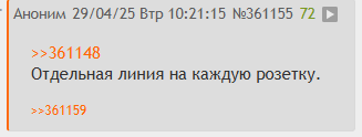 >>361257 >Блага это то, чем человек пользуется, когда живет. УЗО - благо. Интернет как источник информации и средство комуникации - благо. Удобные сервисы (комбо из интернета, продавца и сервиса доставки) - благо. Что тебе не так? >Почему 10 автомато в щитке и куча проводов в стенах, вместо одного, это благо решительно непонятно. Потому что часть обязательна, а часть удобна. Стиралку ты в любом случае повесишь отдельно. Проточный водогрей - отдельно. Электроплита - отдельно. Разделение по группам - это удобно и безопасно. Если отделишь свет от розеток - это удобно. Неотключаемая группа - это удобно. Как всё это реализовать на 1 линии? >По большому счету это лишние микроудобства О. Пошла стадия торгов. Продвигаемся. >для раздувания рынка услуг и всякой путаной тупизны Тупизна только там, где ты думаешь, что я сторонник именно отдельной линии и отдельного автомата на каждую розетку. Это ты от себя домыслил. Моя позиция - рациональное объединение групп. Рациональность определяет заказчик, его хотелки и бюджет. >лишь бы рубить бабло с лоха Внимательно перечитай и ответь на первые 3 вопроса отсюда >>361193