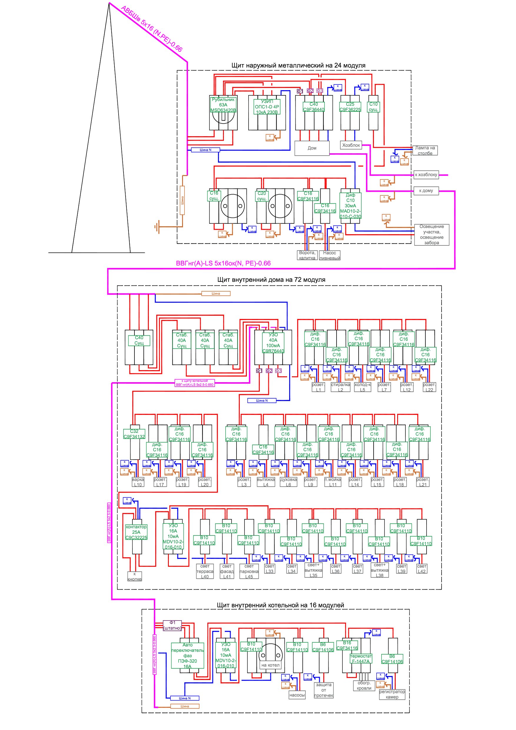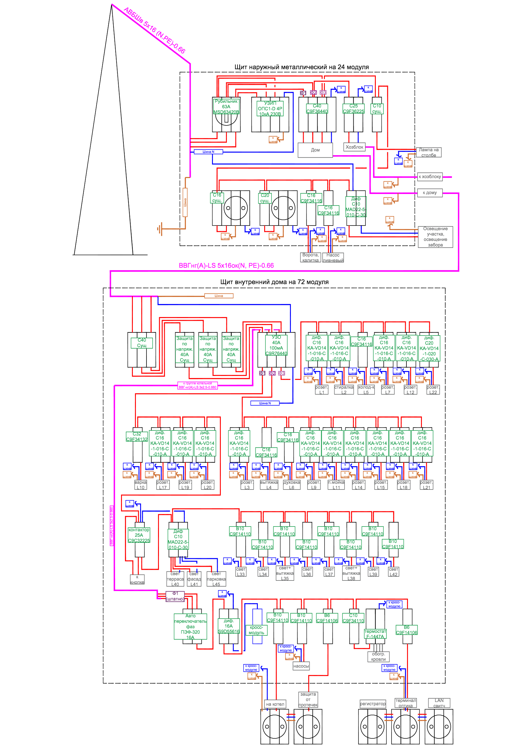 Также если кому делать нехуй посмотрите мой ньюфажный конфиг для дома, будет наружный щит и внутренний, плюс внутри будет мелкий щиток на котельную, нарисовал на основе инфы из инета, разбил по фазам (как это правильно делать в душе не ебу) примерно по 12кВт на фазу получилось, коэфициент загрузки брал с потолка.