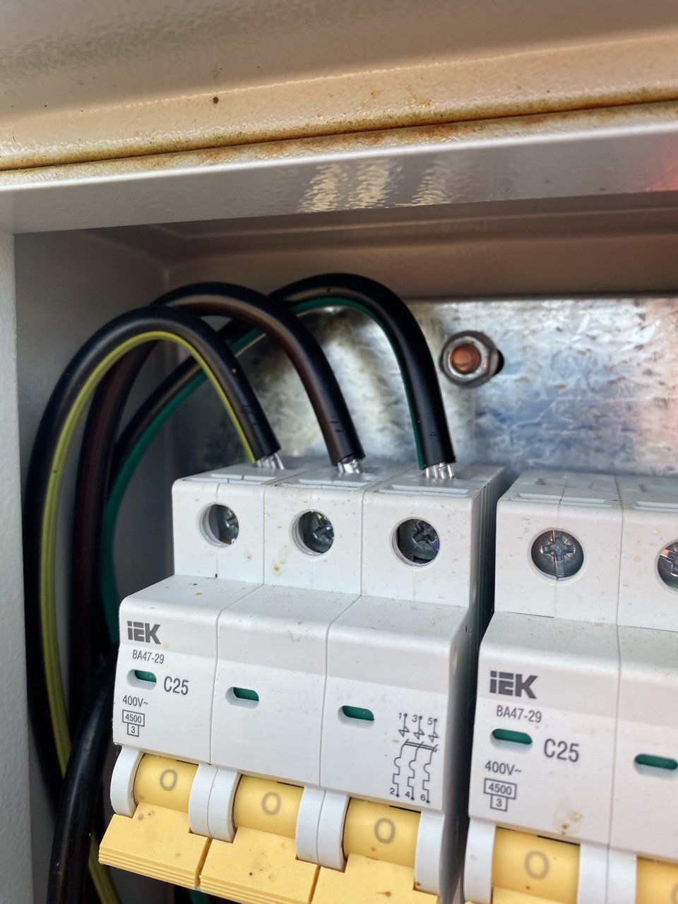 Ебать я электрик! Провода 4мм, потом обжал ншви еще. Хз зачем купил автоматы 25 ампер для розеток 16 ампер. Подразумевалось, что по белым проводам пойдет ноль, но в щитке россетей не смог определить, где он. Но т.к. одна фаза, то похуй. Заклеил дырки для ввода проводов скотчем, чтобы пидарские осы не завелись. Теперь жалею, что не использовал пластмассовый ящик. Каждый раз, когда открываю его, боюсь, что провод с фазой выскочил из вводного автомата и лег на корпус