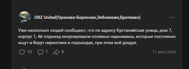 >>370472 Какой-то чел купил квартиру в Братеево. @ 5 лет шиз срёт в тред через прост про Братеево, мониторит все новости и вычленяет каждую, где был замечен наркоман, алкаш, срущая собака.