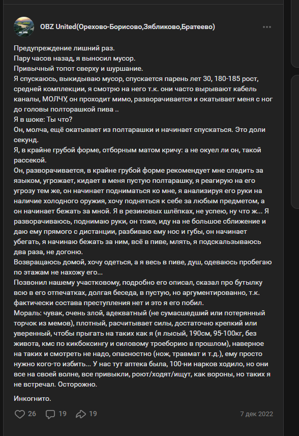 >>370473 Он уже параллельно и соседние районы начал мониторить, лишь бы хоть парочку историй про солевых откопать. Типа "ну они же там рядом живут, значит, на территорию соседнего района забрести могут"))