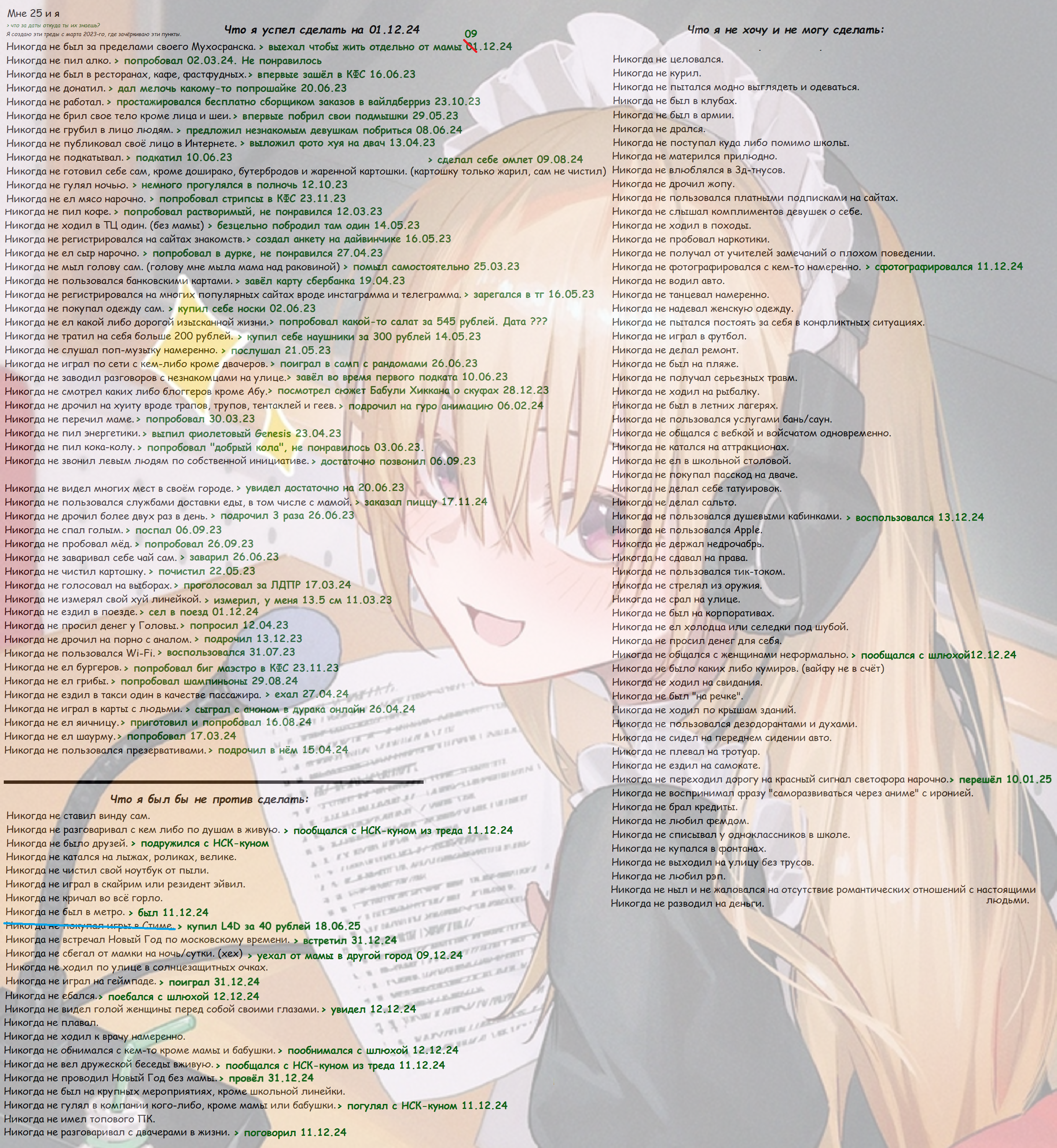 Приветствую двач. Полу сыч полу омежка полу рак полу хер 24 лвл врывается. В 23года осознал чего хочу от жизни, вернее, осознал что не хочу просрать свою жизнь за играми/порно/сериалами/сычеванием в нищите. Составил план вылезаторства на 2025/2026г, там 600 мелких целей получилось. Основной упор на отказ от вредных зависимостей, ежедневное трогание травы, подходы к девушкам, попытки в спорт/финансы, поиск новых увлечений и тд и тп. Стартую по сути с нуля, тк элементарно даже друзей не осталось. Суть в том чтобы на протяжении 12 мес ежедневно вылезаторствовать, через силу, через боль, через слезы. Думаю что через год будет видно имеет ли это всё какой то профит или нет.